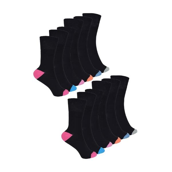 ladies 12 pack bamboo heel toe socks we know youre very busy its hard to find time to take care of yourself so weve made it easy for you with these ladies 12 pack bamboo heel toe socks you can keep your feet as soft and comfy as possible while youre out doing your busy schedule these heel toe socks are made from supersoft bamboo material that is not only naturally antibacterial but moisturewicking as well which combined will naturally reduce sweat which makes these socks perfect for summertime wear these socks are ideal for everyday wear because theyre soft to the touch but durable enough to last a long time they come in 2 colour options which include pinkpurpleblue and lilacbaby pinkgrey plenty of choice to last you all week ladies ditch your regular old flat shoe liners for these super soft bamboo heel toe socks where you can take your sock game to the next level for maximum comfort these bamboo socks are made from 70 bamboo fibre 27 polyester 3 elastane and are ladies one size 48 uk 3742 eur 59 us they come in 2 heel toe colours and are machine washable extra product details ladies 6 pack heel toe socks super soft bamboo material naturally antibacterial moisture wicking fibres perfect for summer time 2 colour options ideal for everyday 70 bamboo fibre 27 polyester 3 elastane ladies one size 48 uk machine washable