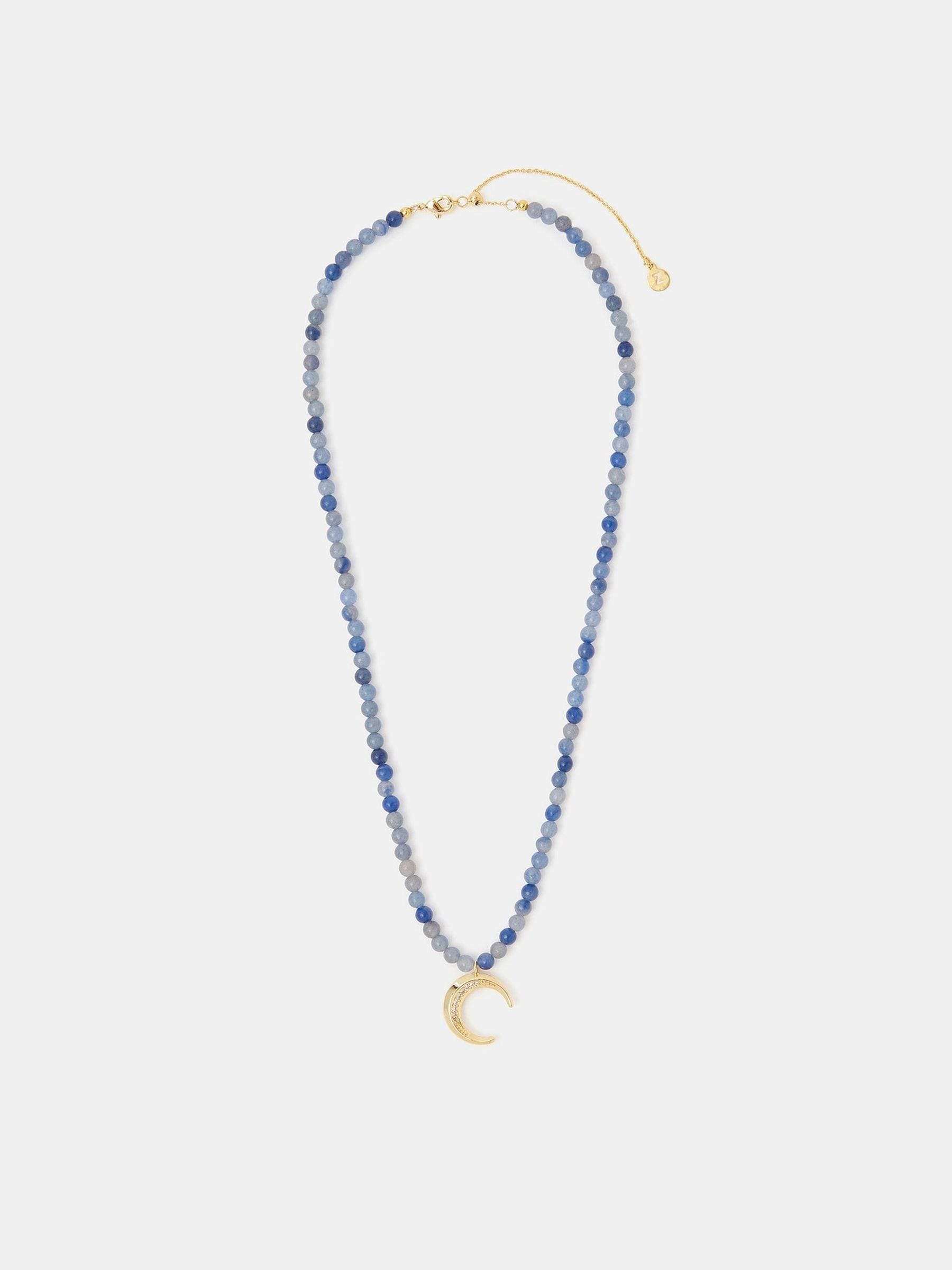 Reminiscent of the night sky, this gorgeous necklace is strung with blue agate beads and finished with a sparkly moon pendant. Fastens with a lobster clasp and extender.