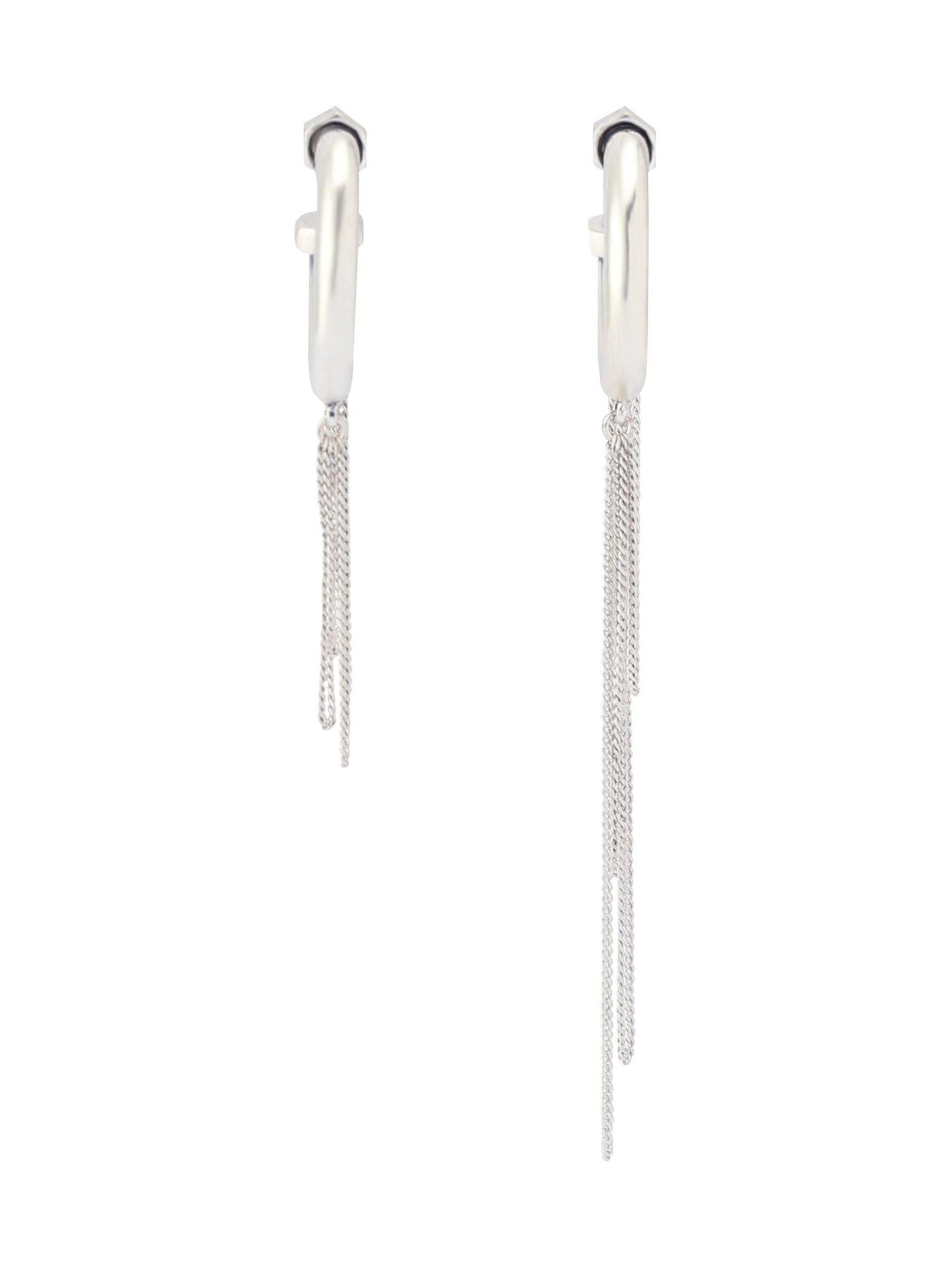 Coordinating mismatched earrings featuring minimal hoop with an open silhouette and refined dangling chains. Posts are made from hypoallergenic stainless steel perfect for everyday. Earrings have a post back closure. Made from brass and stainless steel. Dimensions - Length: 57-86mm, Width: 2.5mm, Diameter: 15mm.