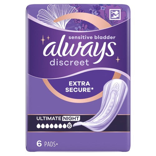 These pads offer the highest level of absorbency in the Always Discreet range, designed for secure and worry-free nighttime use. They provide comprehensive coverage and reliable leak protection while maintaining a discreet profile when worn. The design focuses on advanced security without sacrificing comfort or skin feel, ensuring you can rest soundly.