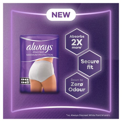 These Always Discreet pants offer maximum protection specifically designed for heavy bladder weakness, enabling you to pursue your daily activities without interruption. They feature a specialised multi-layer construction engineered to manage heavy leaks effectively, delivering security and peace of mind.