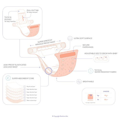 This all-in-one Bambino Mio nappy offers a stylish and soft solution, designed to be as straightforward to use as a disposable alternative. It features a onesize design, adapting comfortably to your baby from birth through to potty training age.