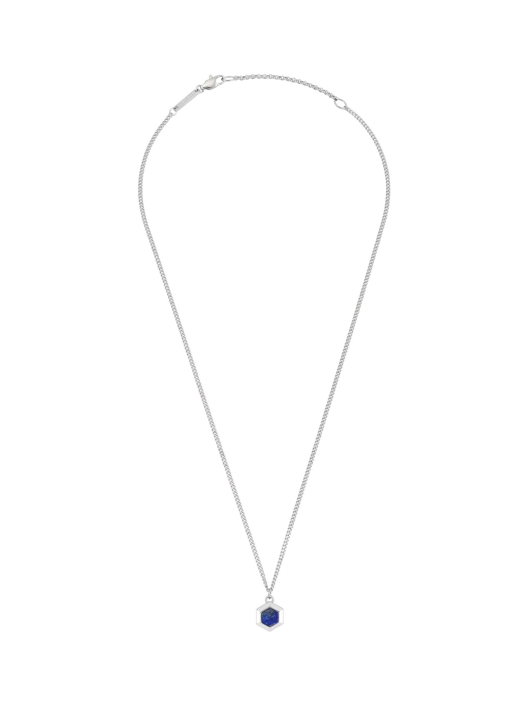 Affirmez votre style avec le collier Bartlett London pour homme, en lapis-lazuli imperméable et maille gourmette hexagonale. Son pendentif hexagonal en lapis-lazuli, suspendu à une chaîne gourmette résistante, allie couleur intense et design robuste. Il apporte une touche d'élégance intemporelle à toutes vos tenues modernes. Longueur : 49 à 52 cm.