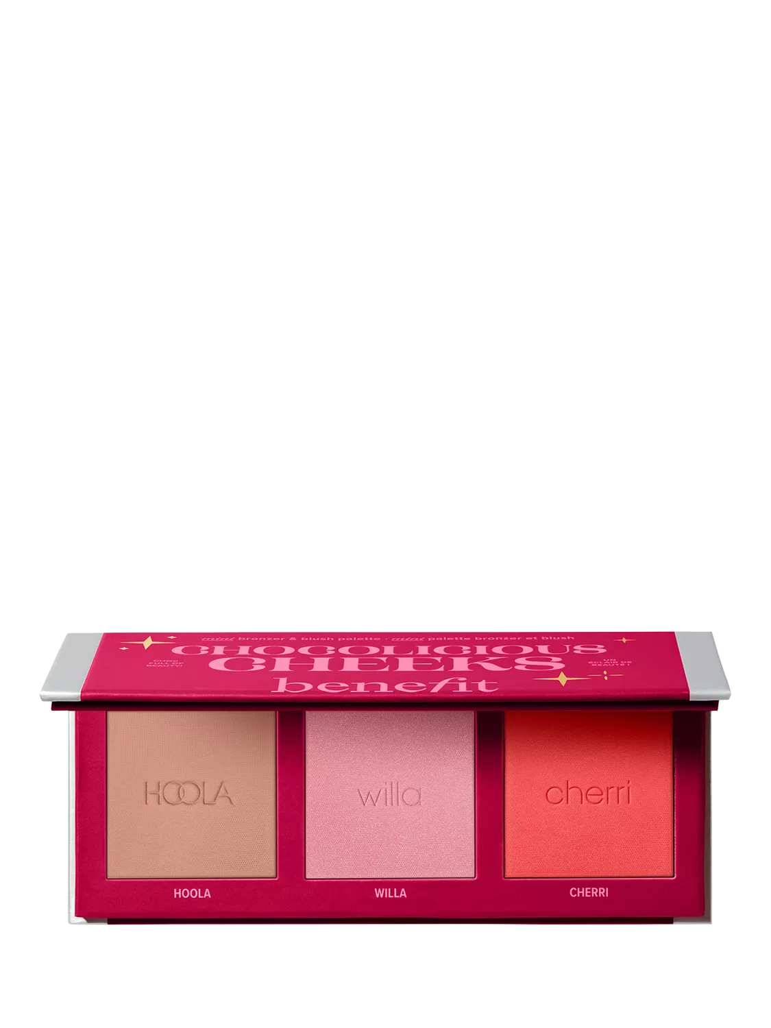 Réchauffez instantanément votre teint avec l'emblématique poudre bronzante mate Hoola (un best-seller de Benefit), puis obtenez un effet bonne mine frais et soyeux avec le blush Willa. Ou osez une touche plus intense avec le blush Cherri en édition limitée, un rouge vif modulable et facile à estomper – idéal pour les fêtes.