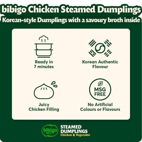 Experience the rich, savoury flavour of bibigo chicken steamed dumplings. Each portion is filled with tender chicken and fresh vegetables, complemented by a delicious, flavourful broth. These dumplings are wrapped with delicately made skins, ensuring a satisfying texture.