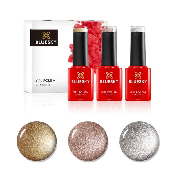 Pourquoi se contenter d'un seul flacon quand vous pouvez en avoir trois nouvelles et magnifiques couleurs Bluesky ? Nos mini trios comprennent nos flacons de gel de 5 ml et complètent parfaitement votre collection Bluesky.