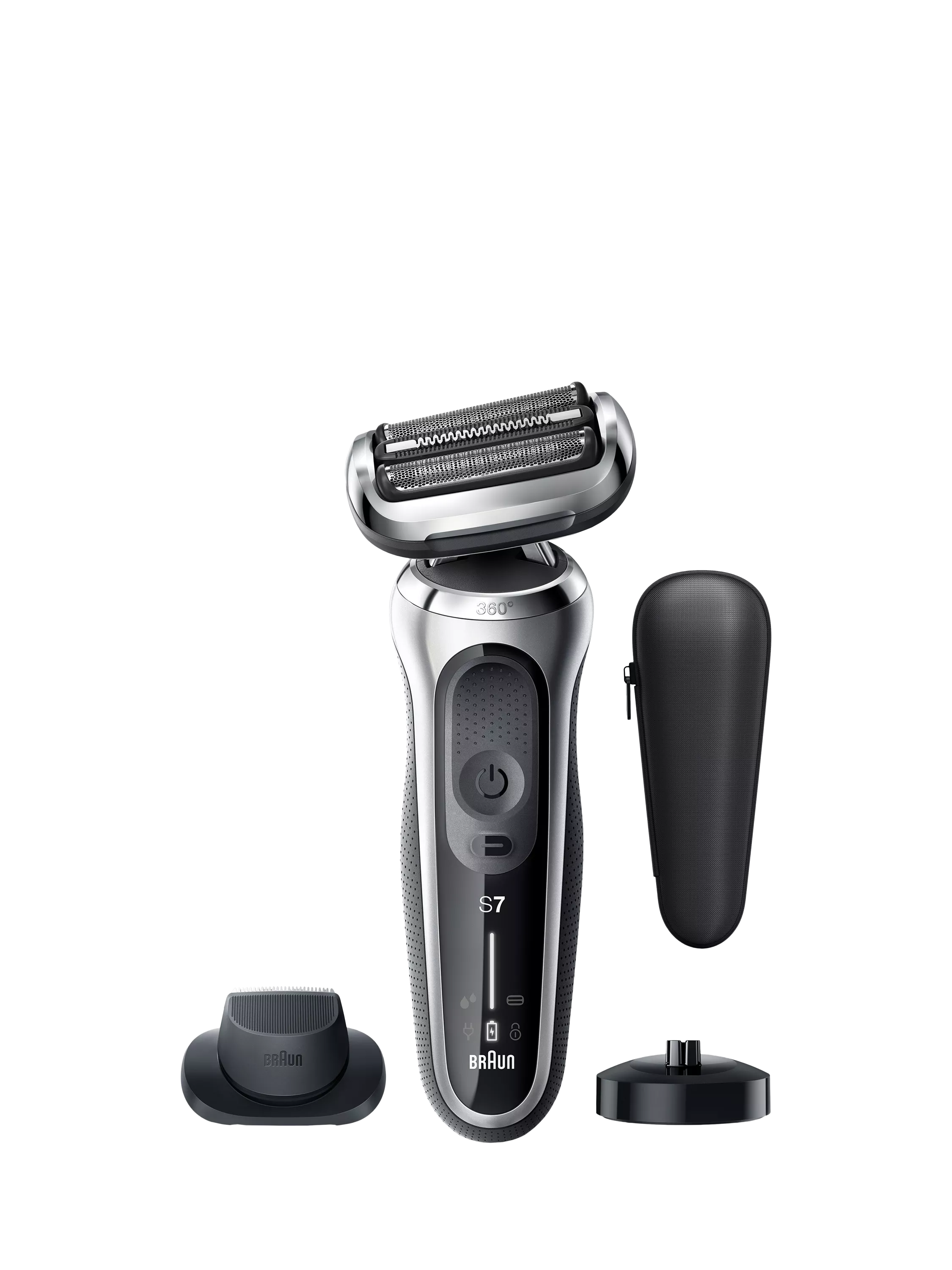 Le rasoir électrique Braun Series 7 pour homme offre une adaptation à 360° pour un rasage impeccable. Doté de la technologie Autosense, il analyse la densité de votre barbe et s'y adapte, éliminant ainsi davantage de poils à chaque passage. Sa batterie Li-Ion offre jusqu'à 3 semaines d'autonomie et se recharge rapidement en 5 minutes. Ce rasoir est 100 % étanche et utilisable sur peau sèche ou humide. Compatible avec le système EasyClick. Accessoire de tondeuse de précision inclus. Contenu de la boîte : 1 rasoir électrique Series 7 pour homme (argent), 1 accessoire de tondeuse de précision, 1 socle de chargement, 1 étui de voyage, 1 adaptateur secteur intelligent (100-240 V) et 1 brosse de nettoyage.