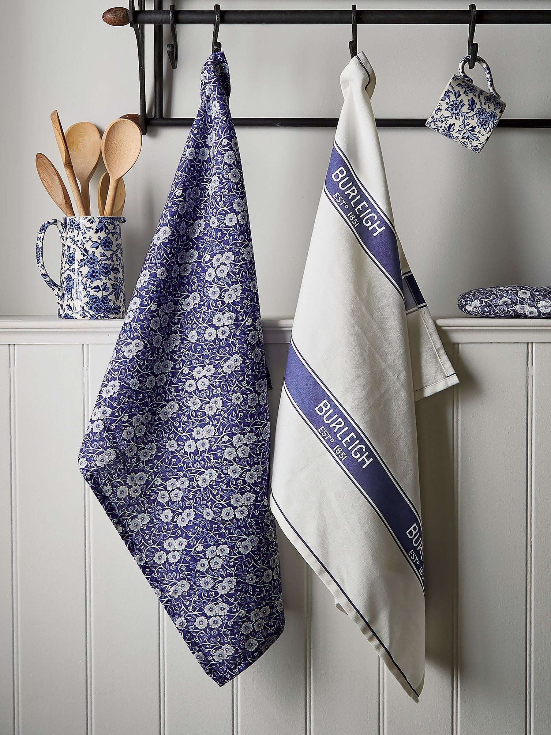 Duo Tea towel pack with signature Calico design alongside a complimentary Burleigh tea towel with Classic indigo stripes. Sold in pairs. (70x 50cm).