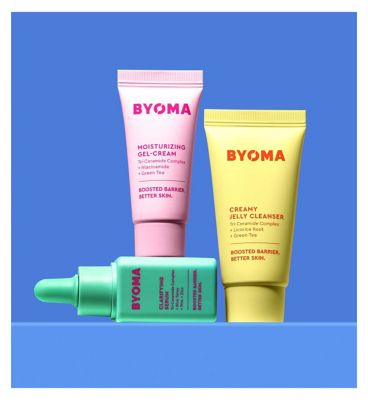 BYOMA Clarifying Starter Kit features dermatologist-approved essentials for active breakouts. This set includes lightweight, gentle, and effective products designed to soothe inflammation and unclog pores. It utilises the Tri-Ceramide Complex to boost skin barrier health for a clear complexion.