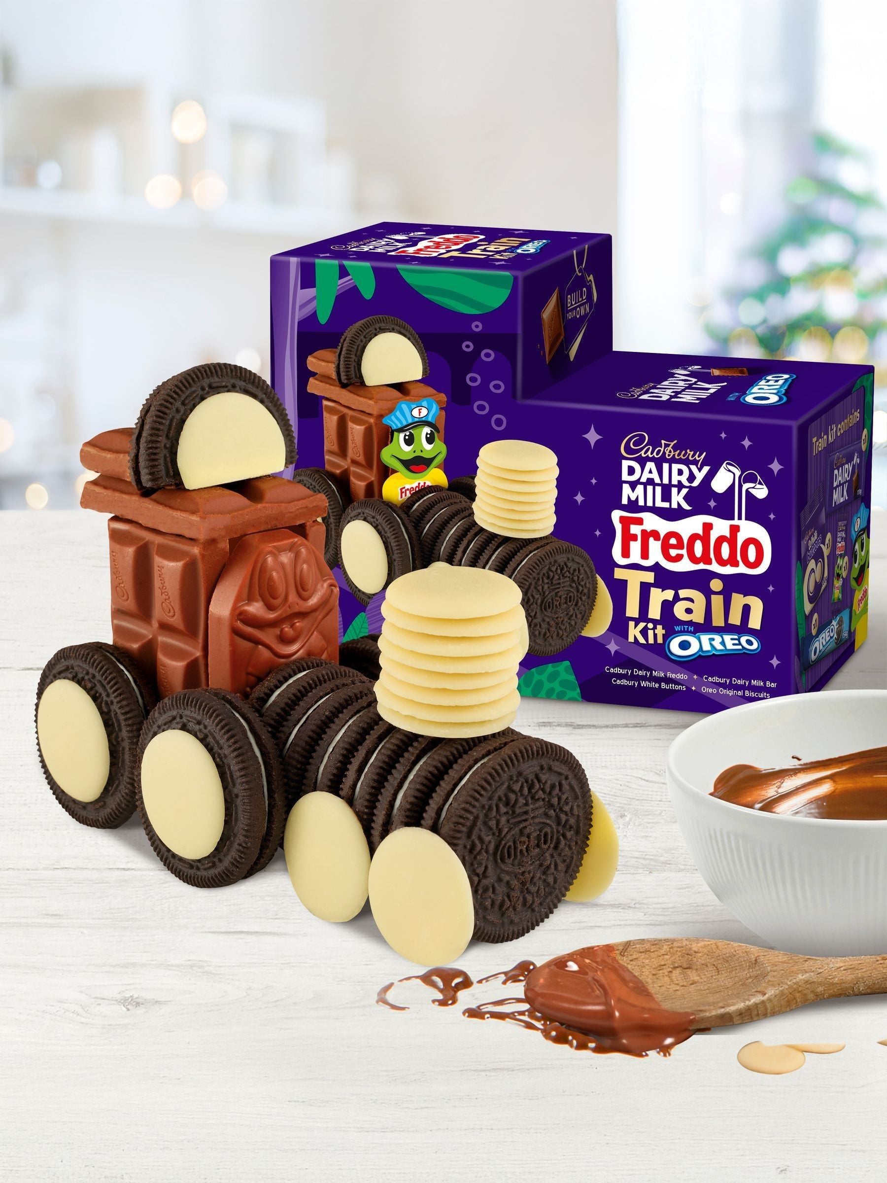 Coffret de train Cadbury Dairy Milk et OREO. Comprend tous les éléments en chocolat et en biscuit pour construire votre train.
