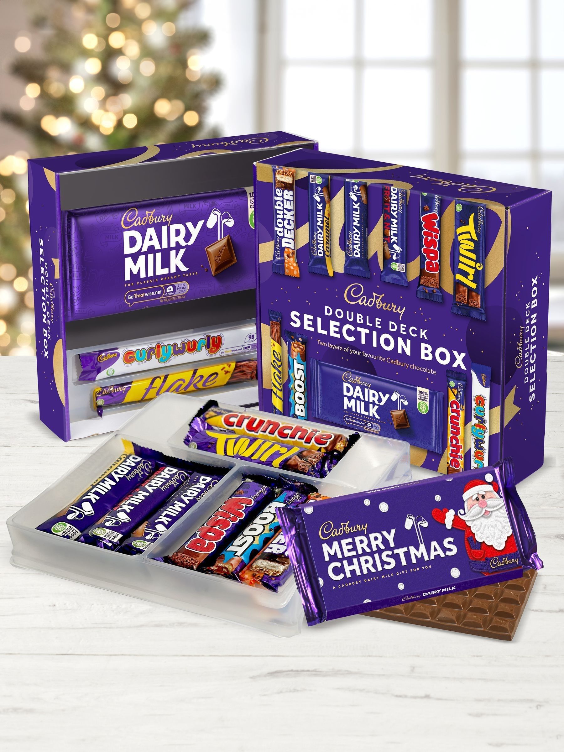 Coffret cadeau Cadbury Double Deck de Noël : Barre de chocolat Cadbury Dairy Milk 110 g avec étui cartonné « Joyeux Noël ». Barre de chocolat Cadbury Dairy Milk 110 g. Barre de chocolat Cadbury Dairy Milk 45 g. Barre de caramel Cadbury Dairy Milk 45 g. Barre de fruits secs Cadbury Dairy Milk 49 g. Barre Cadbury Crunchie 40 g. Barre Cadbury Twirl 43 g. Barre Cadbury Flake 32 g. Barre Cadbury Curly Wurly 21,5 g. Barre Cadbury Wispa 36 g. Barre Cadbury Boost 48,5 g. Barre Cadbury Double Decker 54,5 g.
