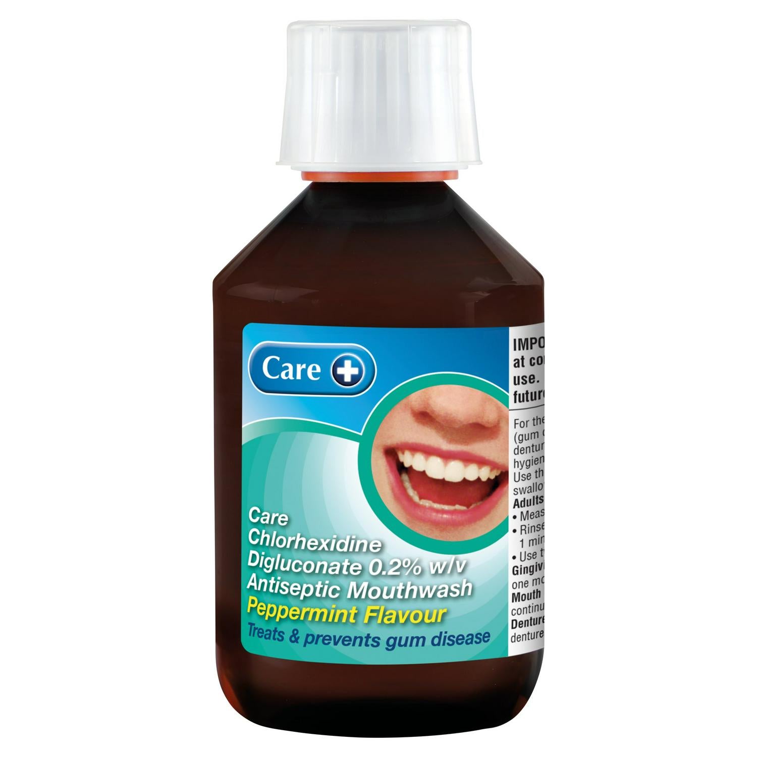 This Care+ Antiseptic Mouthwash contains 0.2% Chlorhexidine Digluconate for targeted oral care. It is formulated with a refreshing peppermint flavour for patient compliance during treatment periods.