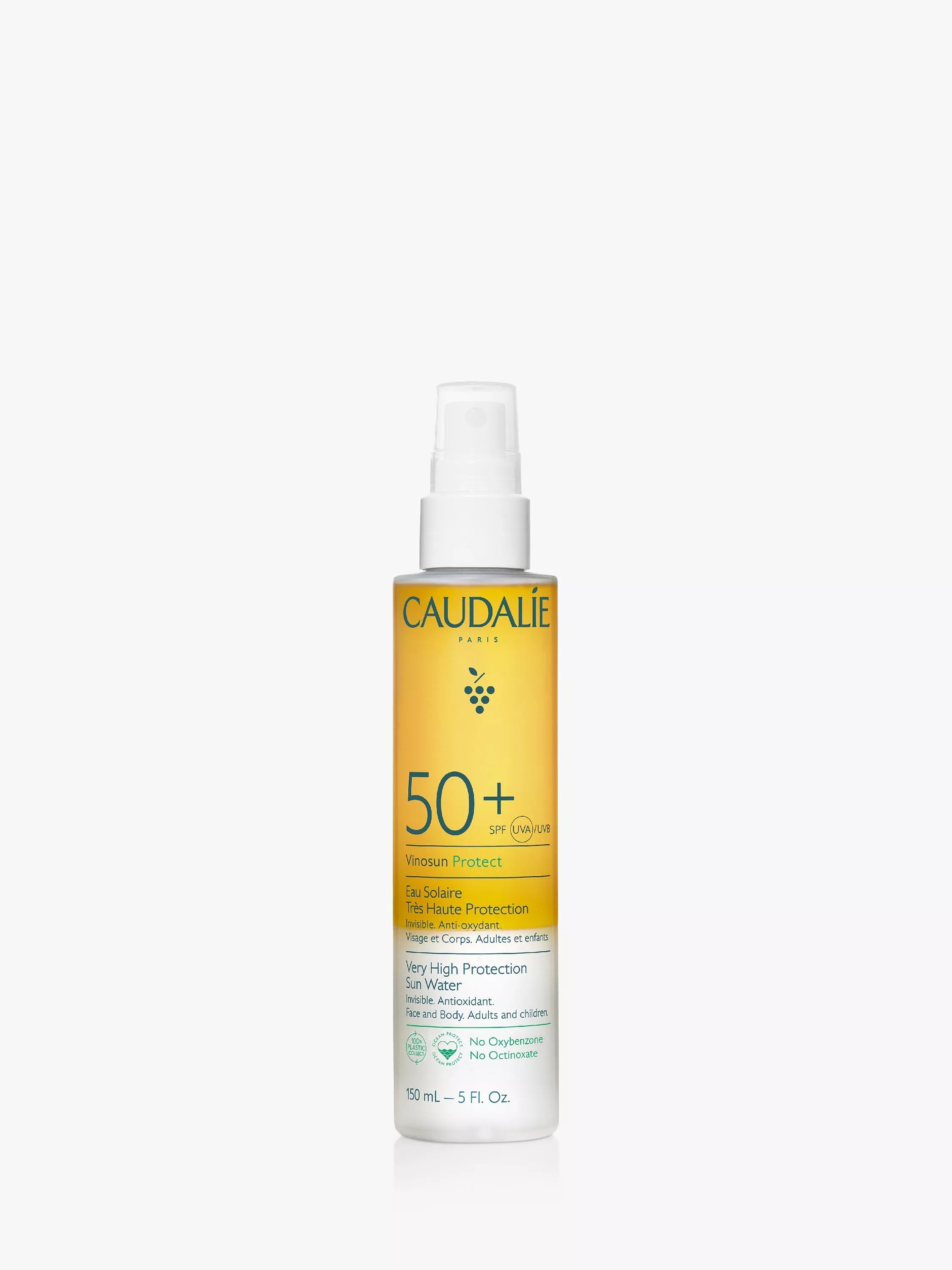 L'Eau Solaire Très Haute Protection SPF50+ de Caudalie protège efficacement le visage et le corps des rayons UVA/UVB tout en apportant une action antioxydante essentielle, adaptée aux peaux les plus sensibles.