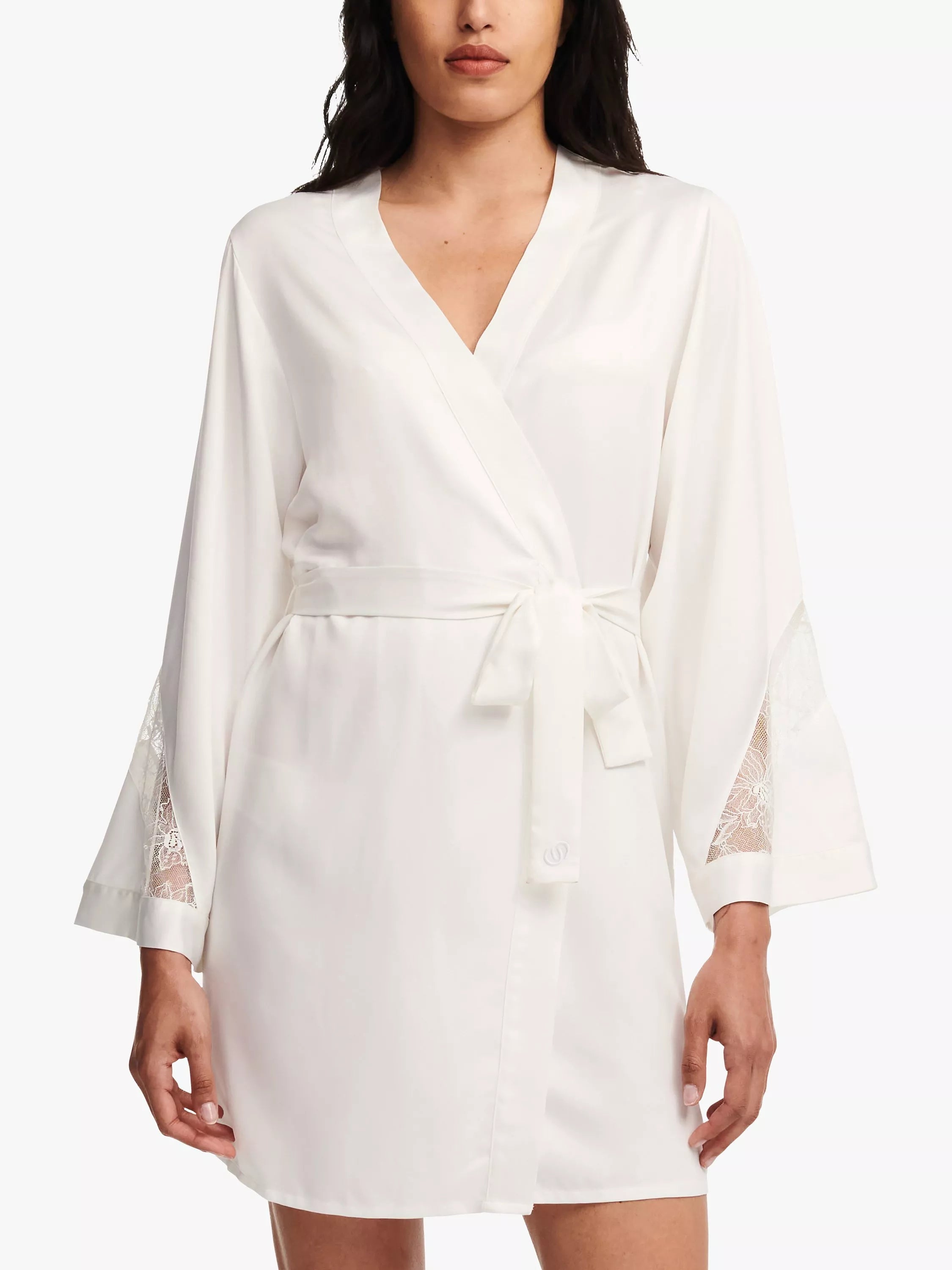 Cette robe en satin sensuelle est ornée d'une incrustation de dentelle florale en bas des manches cloche. Portez-la ouverte ou fermée grâce aux passants en satin et à la ceinture.