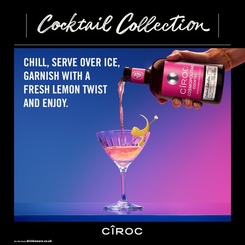 Ciroc Cosmopolitan Cocktail is part of a new collection of bar-quality drinks ready to serve instantly. These expertly crafted beverages allow you to enhance evenings spent with family and friends without extensive preparation. Enjoy the crisp delicacy that Ciroc brings to this classic flavour profile.