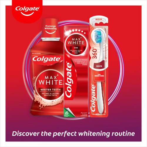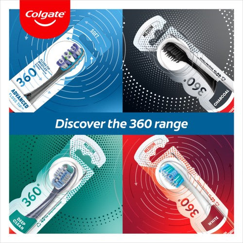 The Colgate 360 Max White Medium toothbrush comes in a convenient 3-pack to support your daily oral hygiene routine. These manual brushes are designed to target surface stains while offering a complete clean across all areas of your mouth.