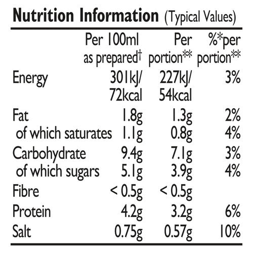 • Quick preparation involves whisking the sachet contents with milk before boiling.