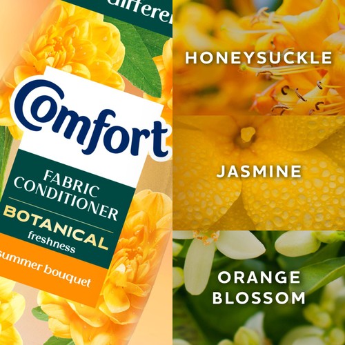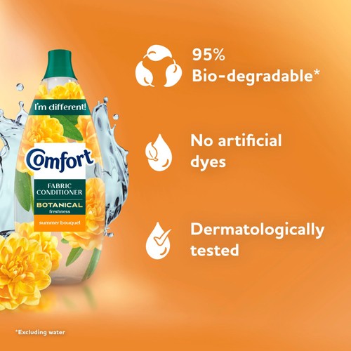 The Comfort Botanical Summer Bouquet Fabric Conditioner provides a unique, nature-inspired laundry experience for your clothes. Its advanced formula is specifically developed to be effective even when washing in shorter, cooler cycles. This liquid softens fabric and enhances breathability while delivering its signature long-lasting freshness profile.