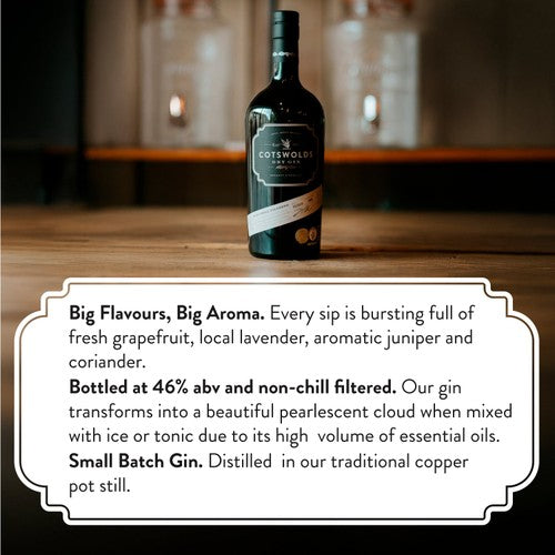 This award-winning spirit is a smooth London dry-style gin, meticulously handcrafted in small batches to ensure refined quality. It showcases a distinctive Cotswolds twist through a blend of nine carefully considered botanicals used in high volume. This high botanical load causes a beautiful pearlescent cloud effect when ice or tonic is added to the spirit for presentation.