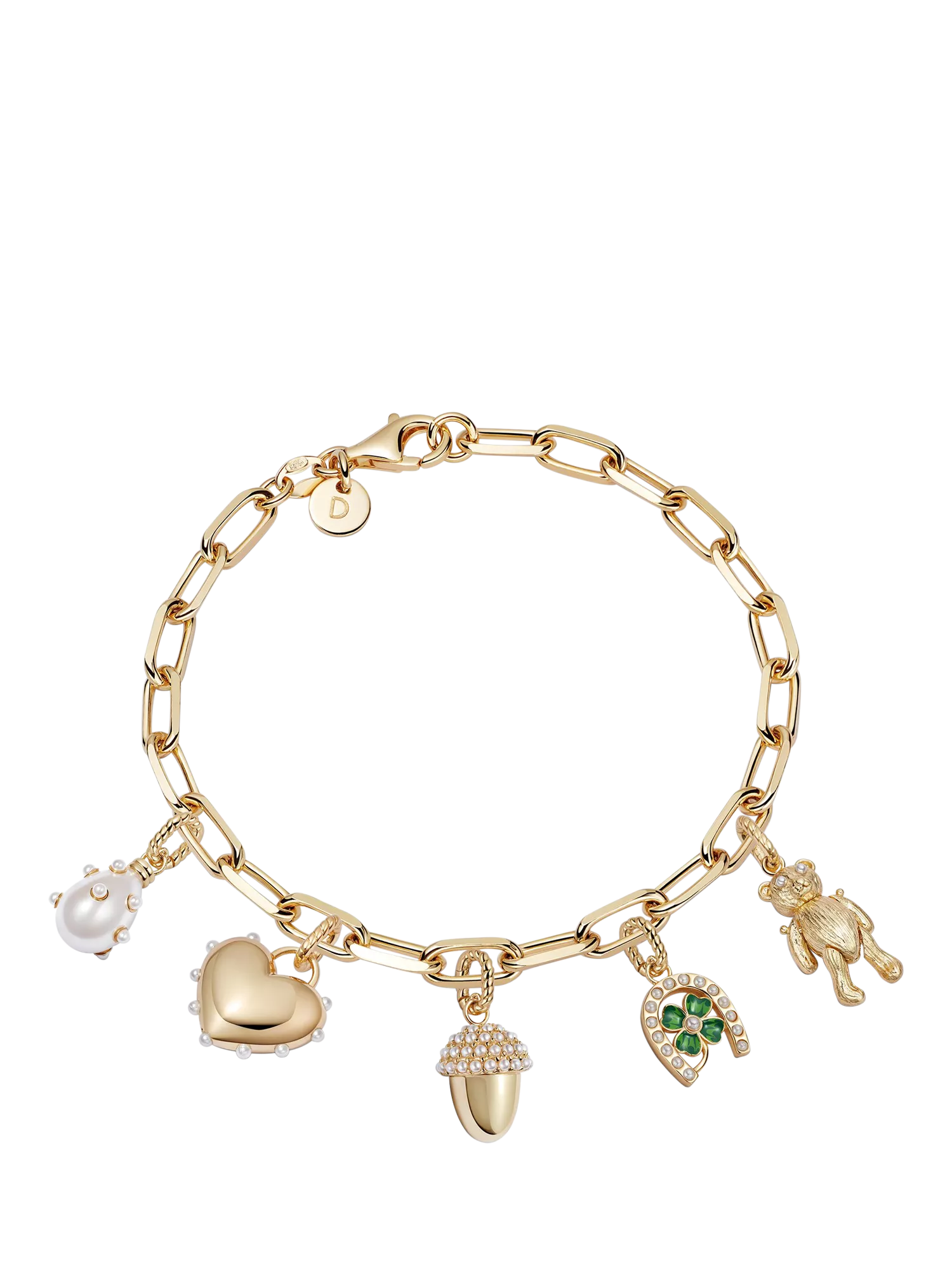 Sublimez votre style avec ce magnifique bracelet à breloques Shrimps x Daisy : une collection complète de breloques ornant une chaîne épaisse. Ce bijou exquis offre un charme et une valeur incomparables, idéal pour ajouter une touche d'élégance britannique à toutes vos tenues.
