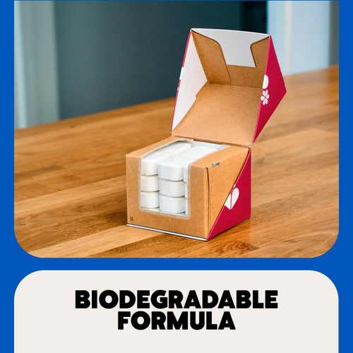 • Delivers thorough cleaning results without plastic wrappers on the tablets themselves.