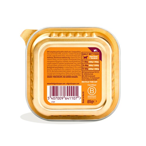 This silky soft paté provides a complete feast suitable for all adult and sterilised cats. It features plenty of free-run chicken in a formula designed to be highly palatable for your feline friend.