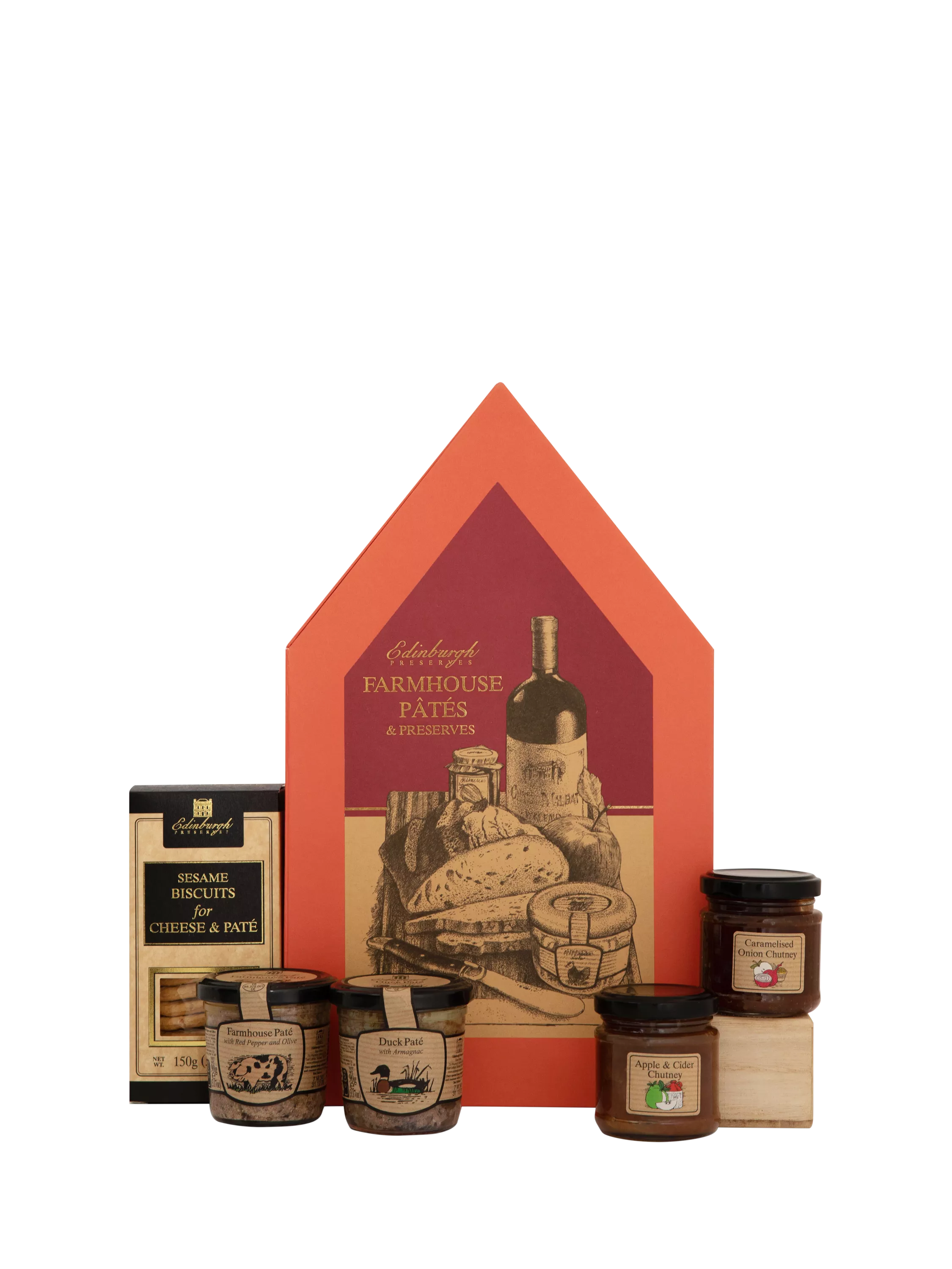 Pour les passionnés de pâté, ce coffret cadeau comprend : un pâté fermier aux poivrons rouges et aux olives (90 g), un pâté de canard à l'Armagnac (90 g), un chutney de pommes et de cidre (100 g), un chutney d'oignons caramélisés (100 g) et des biscuits au sésame pour accompagner le fromage et le pâté (150 g).