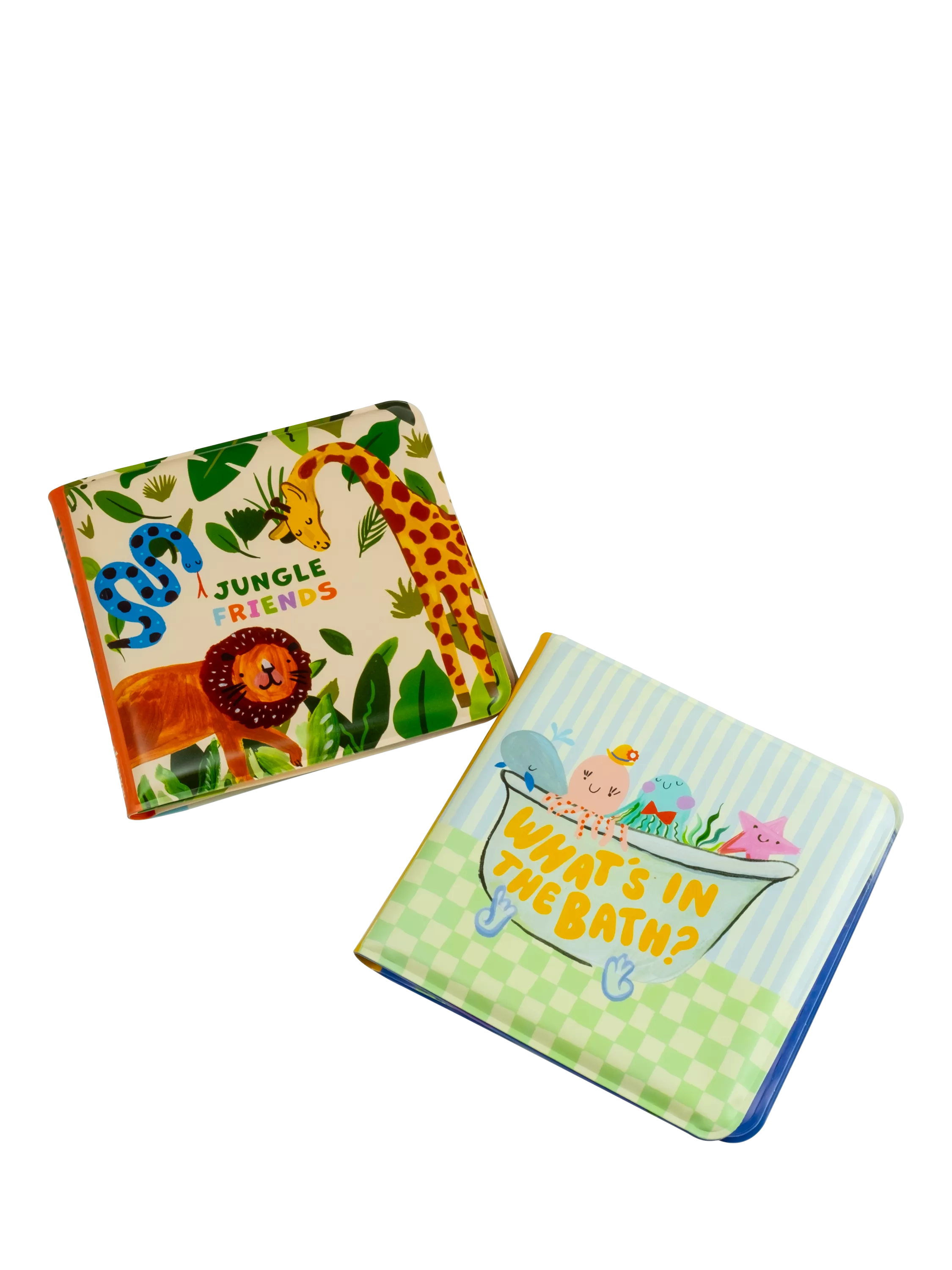 Un coffret de 2 livres de bain amusants pour bébé ; des livres sur le thème de la jungle et de la mer, conçus par Eleanor Bowmer. Ils sont présentés dans une boîte imprimée.