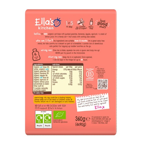 This Ella's Kitchen pouch offers a wholesome, ready-to-eat snack suitable for toddlers from 12 months onward. It features a carefully balanced blend of pureed fruits mixed with an organic oat base for easy nutrition while travelling. This convenient blend provides a substantial snack option for topping up growing tummies throughout the day.