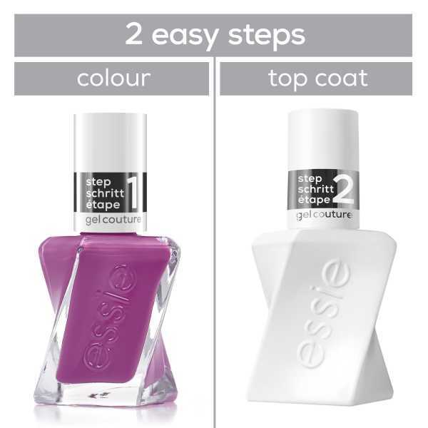 Essie Gel Couture in 'Strut With It' is a midtone violet vegan nail polish that features distinctive pink undertones for a stylish look. This formula delivers a glass-like shine and plump volume, closely mimicking a professional gel manicure experience at home. The application process is streamlined into two simple steps, requiring no UV lamp for curing.
