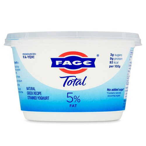 Fage Total 5% Fat Natural Greek Recipe Strained Yoghurt offers a thick, rich texture crafted using only milk and yoghurt cultures. This strained product is naturally high in protein and provides essential calcium for your diet. It maintains purity by being entirely free from added preservatives or artificial additives.