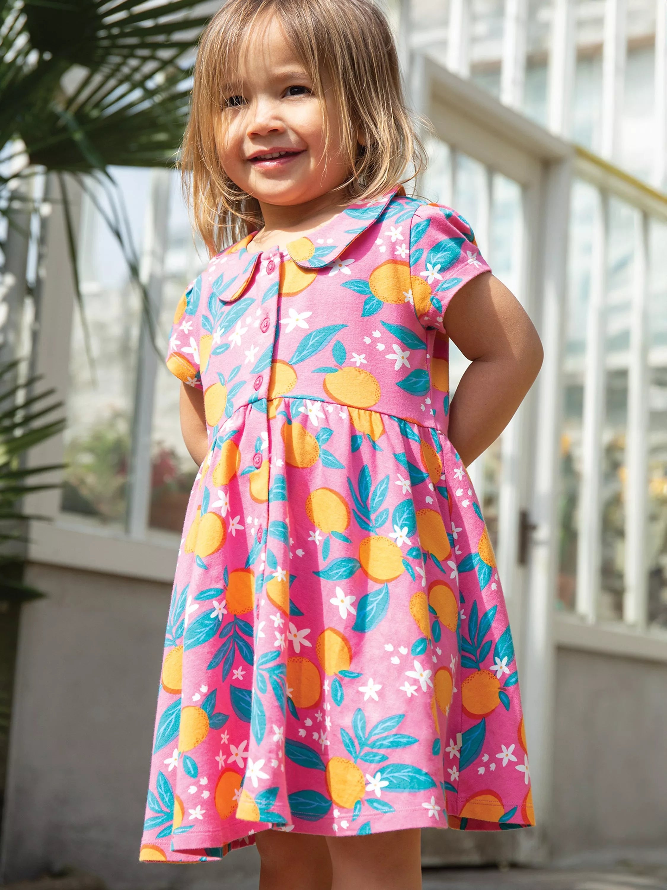 Ornée de fleurs d'oranger, cette robe courte à manches courtes et coupe évasée de la marque Frugi est confectionnée en coton biologique.
