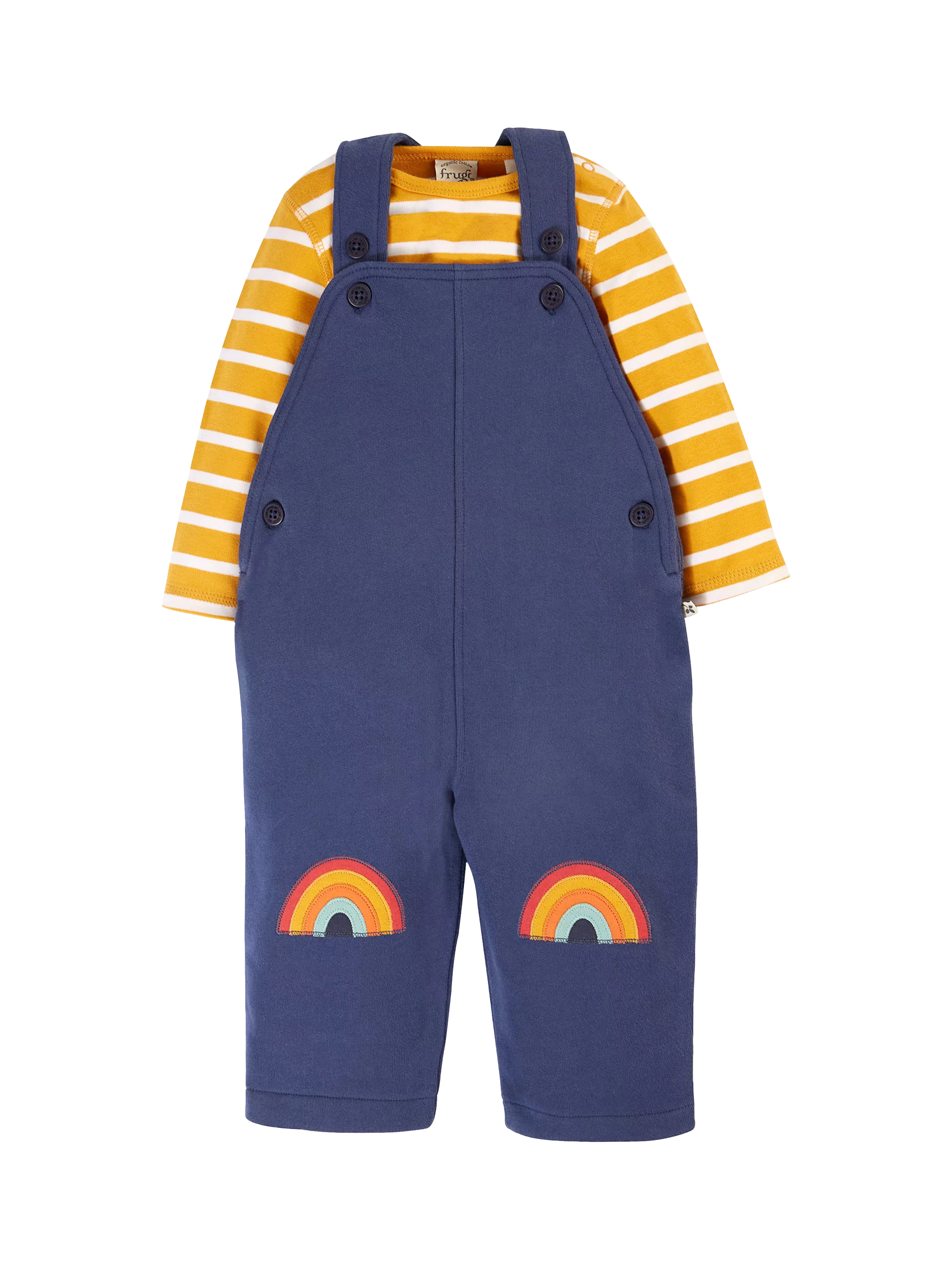 Cet ensemble deux pièces en coton biologique comprend un body à manches longues et une salopette longue à bretelles boutonnées réglables. Il est orné d'un patch arc-en-ciel sur chaque genou.