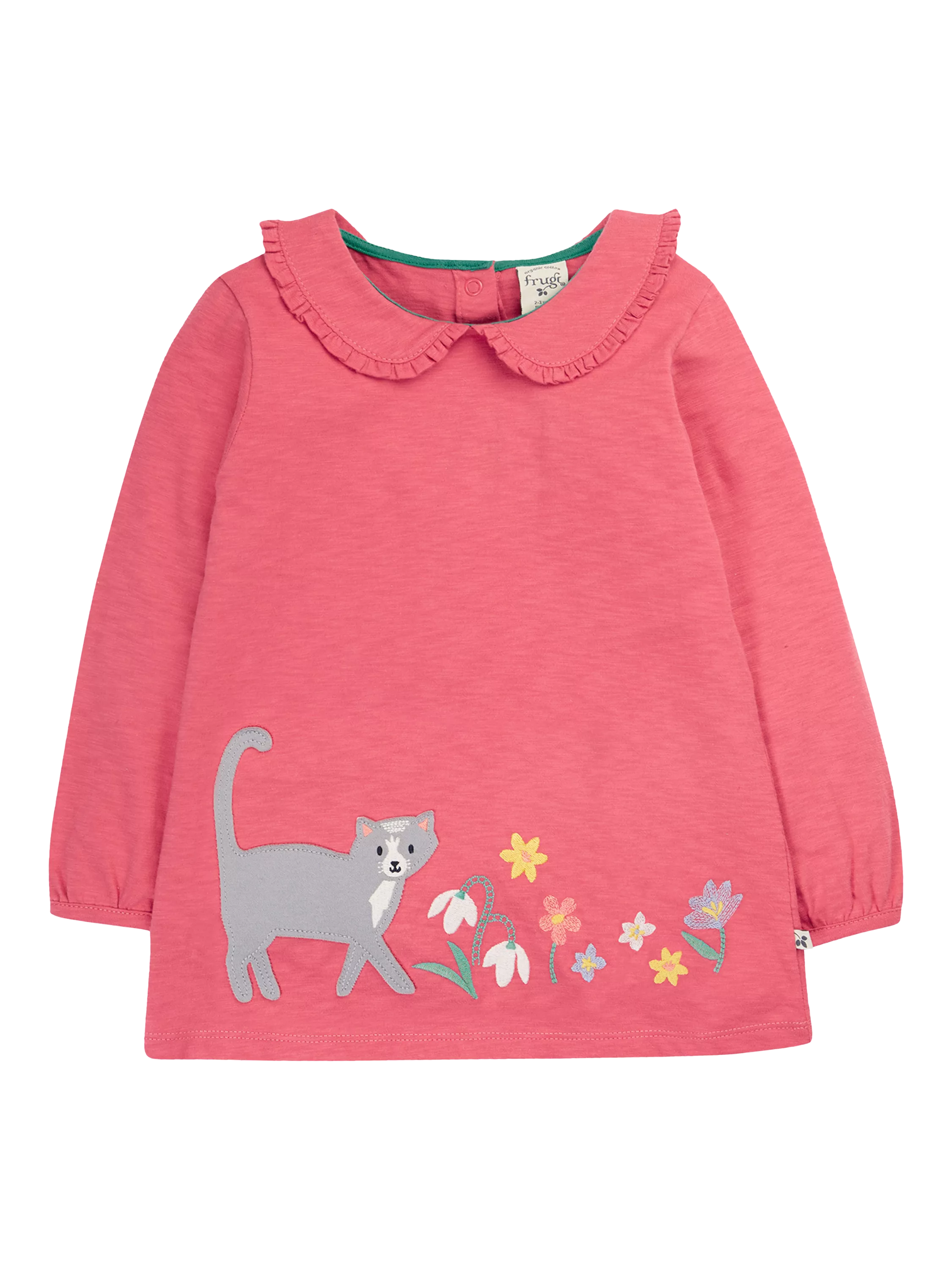 Ce haut à manches longues en jersey de coton biologique flammé présente un motif chat et floral appliqué, rehaussé d'un col Claudine. Une ouverture à boutons-pression au dos facilite l'habillage.