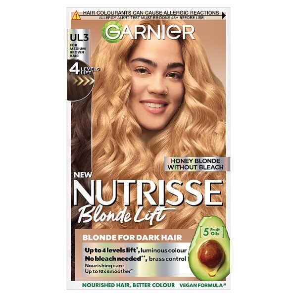 Nutrisse Blonde Lift est une coloration permanente crème vibrante qui offre des résultats visibles, même sur cheveux foncés. Sa formule nourrissante et non coulante facilite l'application. Obtenez des cheveux plus brillants et nourris en une seule étape. Technologie éclaircissante : une technologie innovante qui éclaircit la couleur jusqu'à 4 tons sans décoloration. Spécialement conçue pour les cheveux foncés naturels non traités, cette nouvelle technologie éclaircissante permet d'obtenir un blond lumineux sans décoloration. Après-shampoing Deep Blue Anti-Cuir Cuivré : cet après-shampoing contient des pigments neutralisants ultra-puissants pour contrôler les reflets chauds et cuivrés et obtenir un blond lumineux. Cheveux jusqu'à 10 fois plus lisses et plus forts. 5 huiles de fruits (avocat, olive, coco, argan et karité) nourrissent vos cheveux. Des cheveux nourris pour une couleur plus intense et éclatante. Convient à tous les types et textures de cheveux. Formule végane approuvée par Crueltyfree International. Test instrumental après utilisation. Pas besoin de décoloration avant utilisation. Test de brossage instrumental à haute répétition. Sans ingrédients ni sous-produits d'origine animale.
