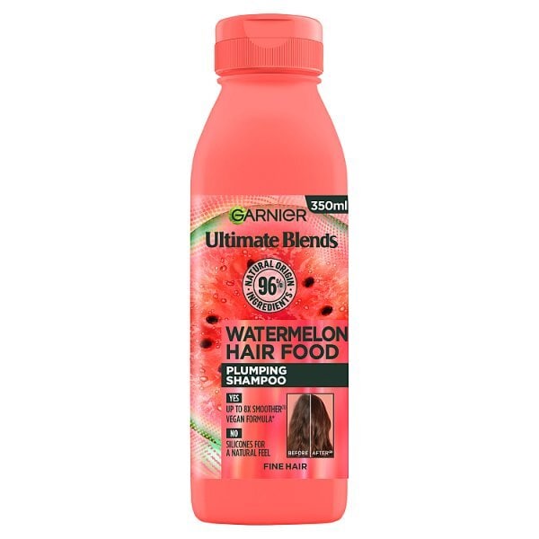 Le shampooing Garnier Ultimate Blends Hair Food à la pastèque nettoie et repulpe les cheveux fins. Sa mousse légère nettoie en douceur et revitalise les cheveux sans les alourdir. Oui, 96 ingrédients naturels associés à la pastèque et à la grenade. Oui, formule végane sans ingrédients ni sous-produits animaux. Oui, flacon recyclable à 100 %, composé à 50 % de plastique recyclé. Sans silicones pour une sensation naturelle.
