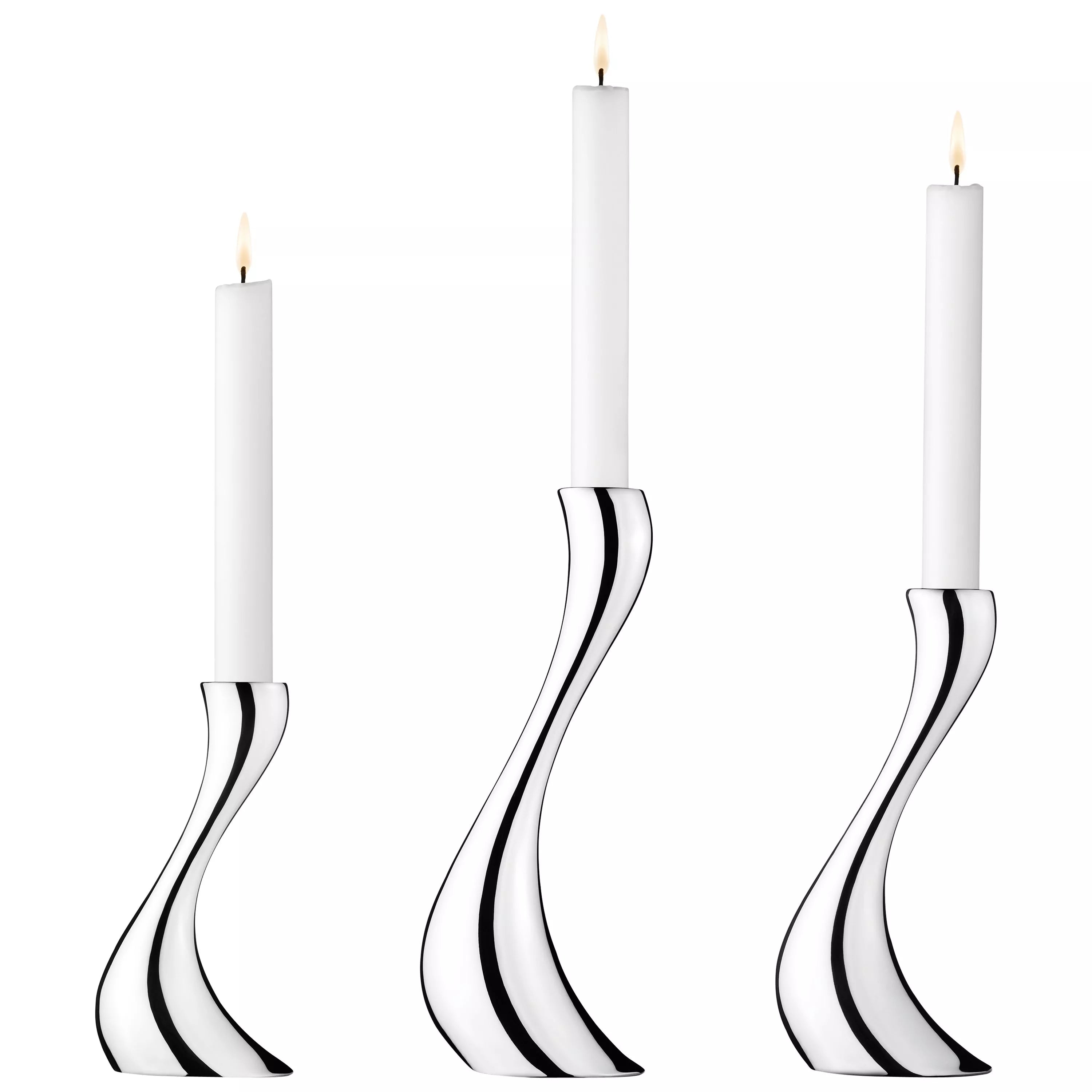 Ce trio de chandeliers sinueux, évoquant des serpents, donne une impression de mouvement. Création originale de la collection COBRA de Georg Jensen, ils sont fabriqués en acier inoxydable durable et d'une grande pureté.