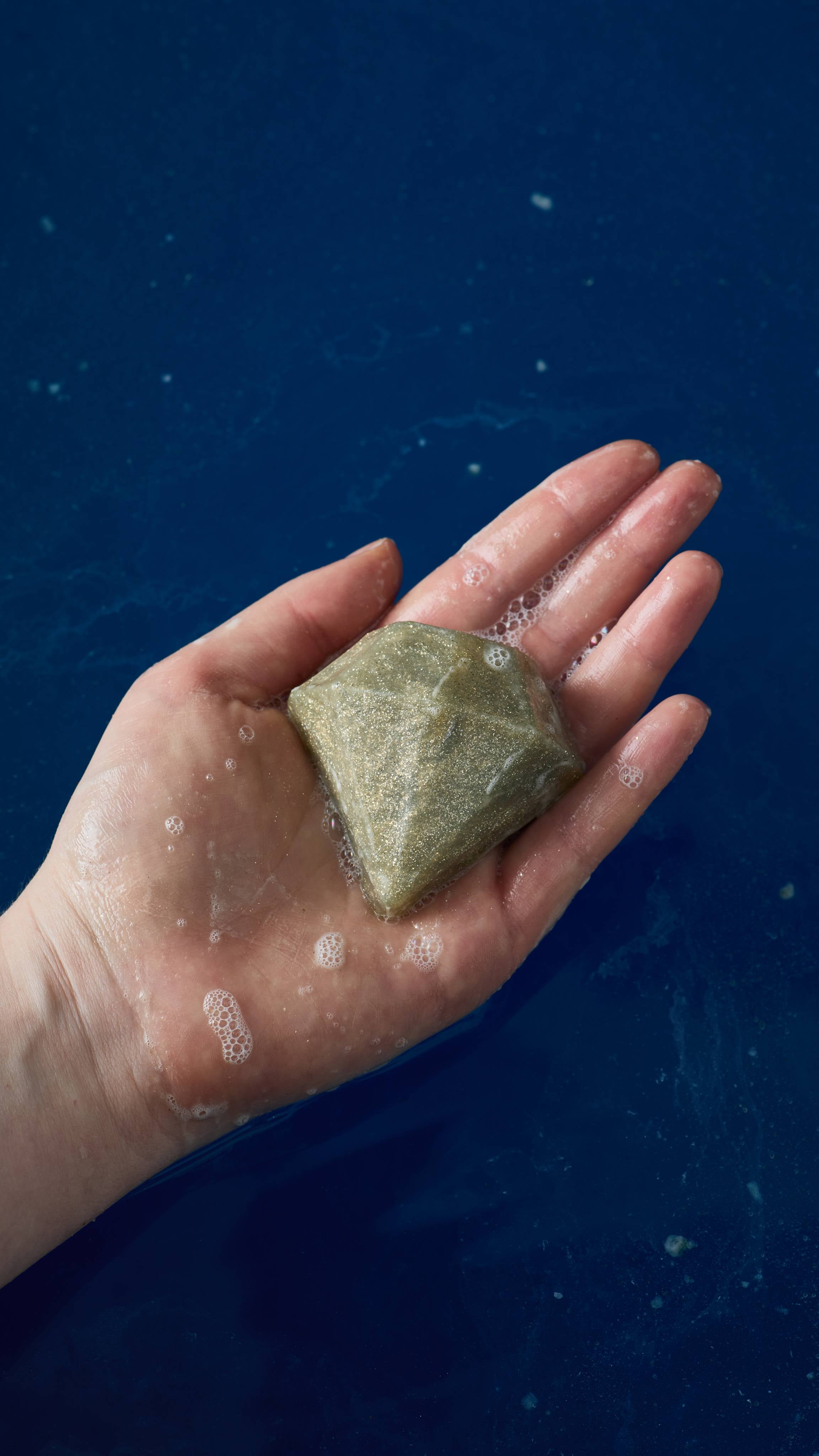 À l'intérieur, un savon en forme de diamant (or, argent ou vert) vous attend, secret et parfumé comme la bombe de bain. Scannez les trois savons avec Lush Lens dans l'application Lush et conservez-les dans votre portefeuille pour de futures aventures dans l'univers intergalactique Lush.