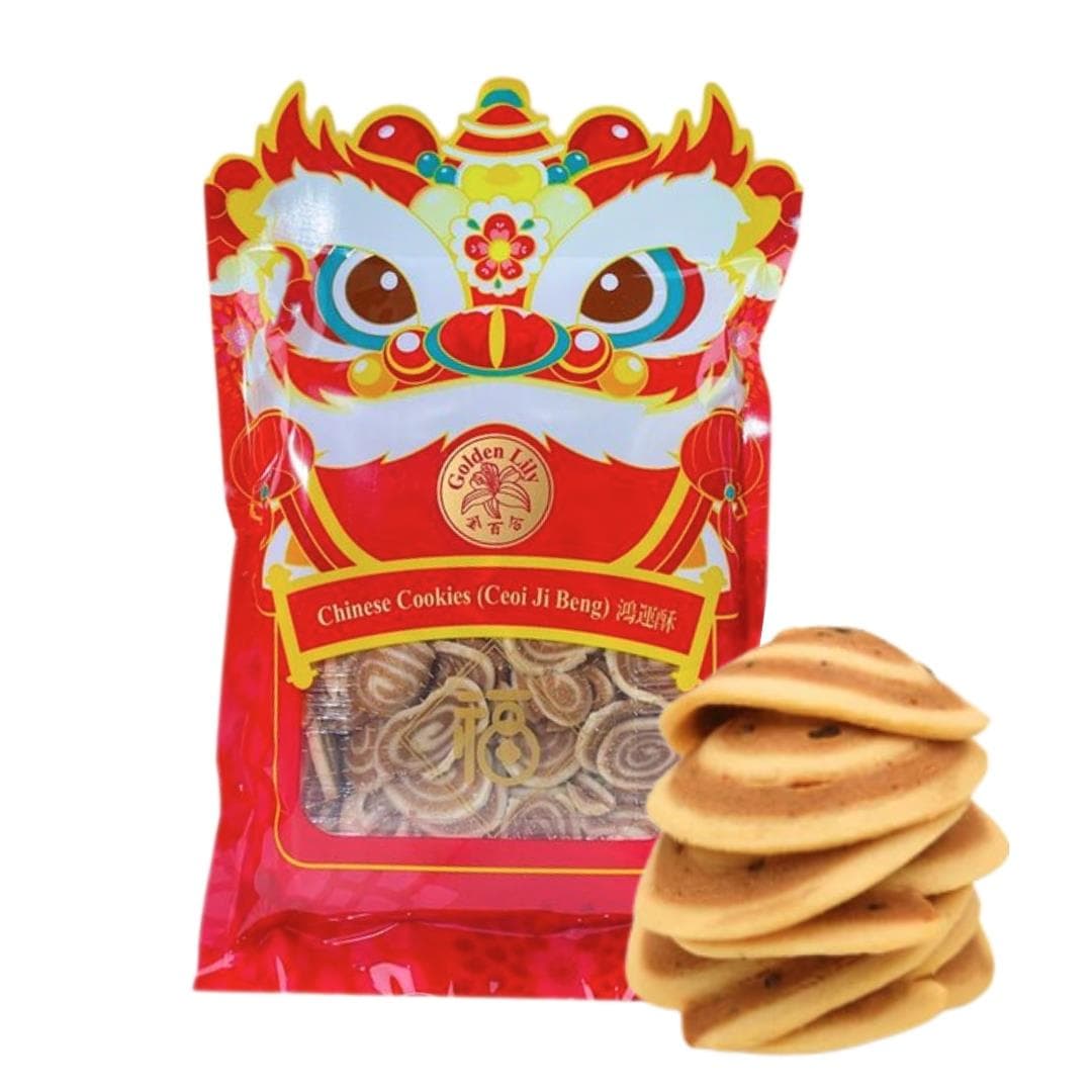 Les biscuits chinois « Lys d'or » (Ceoi Ji Beng) sont un classique de la pâtisserie chinoise, réputés pour leur texture friable et leur douce saveur. Confectionnés avec des ingrédients simples comme la farine, le sucre et une touche de matière grasse végétale, ces biscuits sont façonnés en disques et cuits jusqu'à obtenir une belle couleur dorée. Parfaits pour accompagner un thé ou un café, les Ceoi Ji Beng offrent un goût nostalgique de la pâtisserie chinoise traditionnelle, souvent dégustés lors des fêtes ou comme en-cas quotidien. Leur saveur délicate et riche en fait un favori intemporel pour tous les âges.