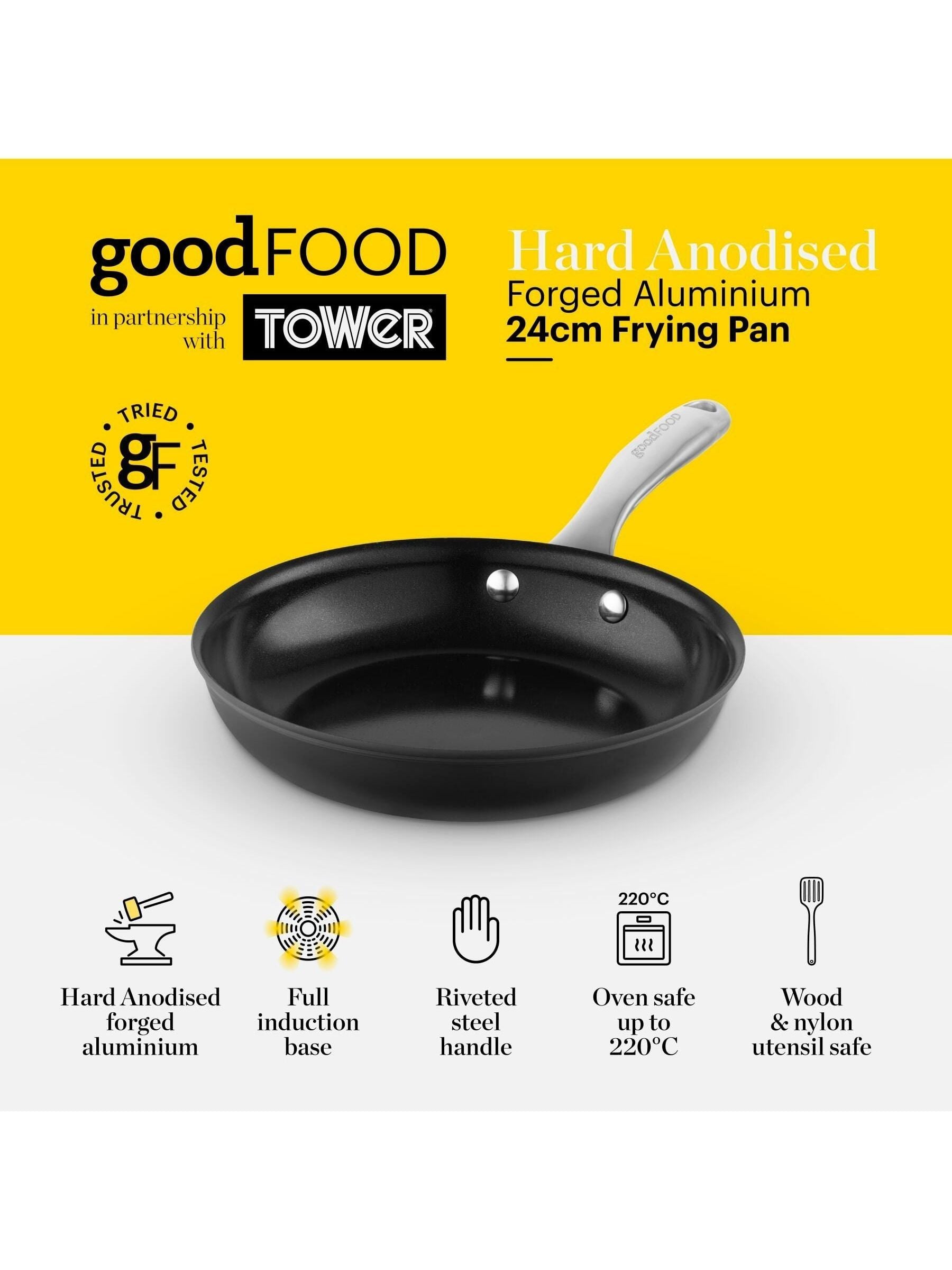 Get the most out of your kitchen with this 24cm frying pan from GOOD FOOD in partnership with TOWER. Specially designed to be used with the vast GOOD FOOD recipe library, the frying pan offers simple serving to avoid unwanted spillages. crafted from 3.5mm forged hard anodised aluminium, the pan offers rapid heat and even heat distribution for more thorough cooking with no heat spots, whilst a riveted steel handle offers comfort and easy manoeuvrability. Our SUPERIOR CERAMIC non-stick coating is 10x stronger than standard non-stick coatings and offers superior food release and healthy cooking with minimal oil required, whilst it is also free from PFAS, PFOA, LEAD and CADMIUM. The pan is oven safe up to 220 °C, whilst the full induction base allows for use on any hob type, including induction for greater cooking versatility. It is dishwasher safe for simple and fuss-free cleaning, although handwashing is recommended to keep the ceramic coating in pristine condition. GOOD FOOD TRIED & TESTED: capable of creating a perfectly seared steak or pan-fried fish, this frying pan is ideal for family cooking. All products from GOOD FOOD in partnership with TOWER have been TRIED AND TESTED by our expert RECIPE DEVELOPMENT TEAM to ensure they work perfectly with our vast online library of over 15,000 unique recipes. HIGH QUALITY COOKWARE: expertly crafted from 3.5mm forged hard anodised aluminium with a riveted steel handle, this pan is durable & built to last. Hard anodised aluminium fuses aluminium with a non-stick coating for increased durability. It is 30% tougher than stainless steel and is designed to withstand consistent daily use, making it ideal for everyday cooking, whether you are a novice in the kitchen or a seasoned pro. SUITABLE FOR ALL HOB TYPES: the full induction base offers quick & even heat distribution so food is perfectly cooked with no hot spots. It also lets you use the pan on any hob type, including induction, for great cooking versatility. You can also use the pan in the oven up to 220 °C, so it’s perfect for use with the vast GOOD FOOD online recipe library. SUPERIOR CERAMIC NON-STICK COATING: SUPERIOR CERAMIC coating is 10x stronger than traditional non-stick coatings and offers superior food release and healthier cooking with little to no oil required. It is free from PFAS, PFOA, CADMIUM & LEAD, and is safe to use nylon, silicone & wooden utensils without damaging the non-stick coating. PREMIUM RIVETED STEEL HANDLE: The handle is crafted from RIVETED STEEL for added comfort, offering greater strength and manoeuvrability when cooking. The STEEL HANDLE means that the pan is safe to use in the oven at temperatures of 220 °C. The handle will heat up during cooking, so a cloth or protective glove is advised for safety. DISHWASHER SAFE: the pan can be used in the dishwasher for simple and fuss-free cleaning, although handwashing is recommended to ensure the NON-STICK COATING always performs at its best. 25 YEAR GUARANTEE: professional quality with a standard 1 YEAR GUARANTEE and an optional 24 YEAR EXTENSION, subject to product registration online (CERAMIC COATING has a 5 YEAR GUARANTEE).