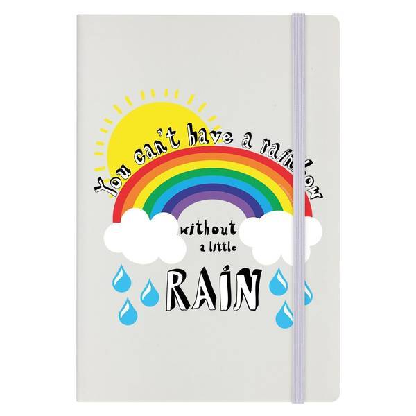material paper height 21cm width 14cm design clouds rainbow raindrop sun text elastic fastener hardback lined pages