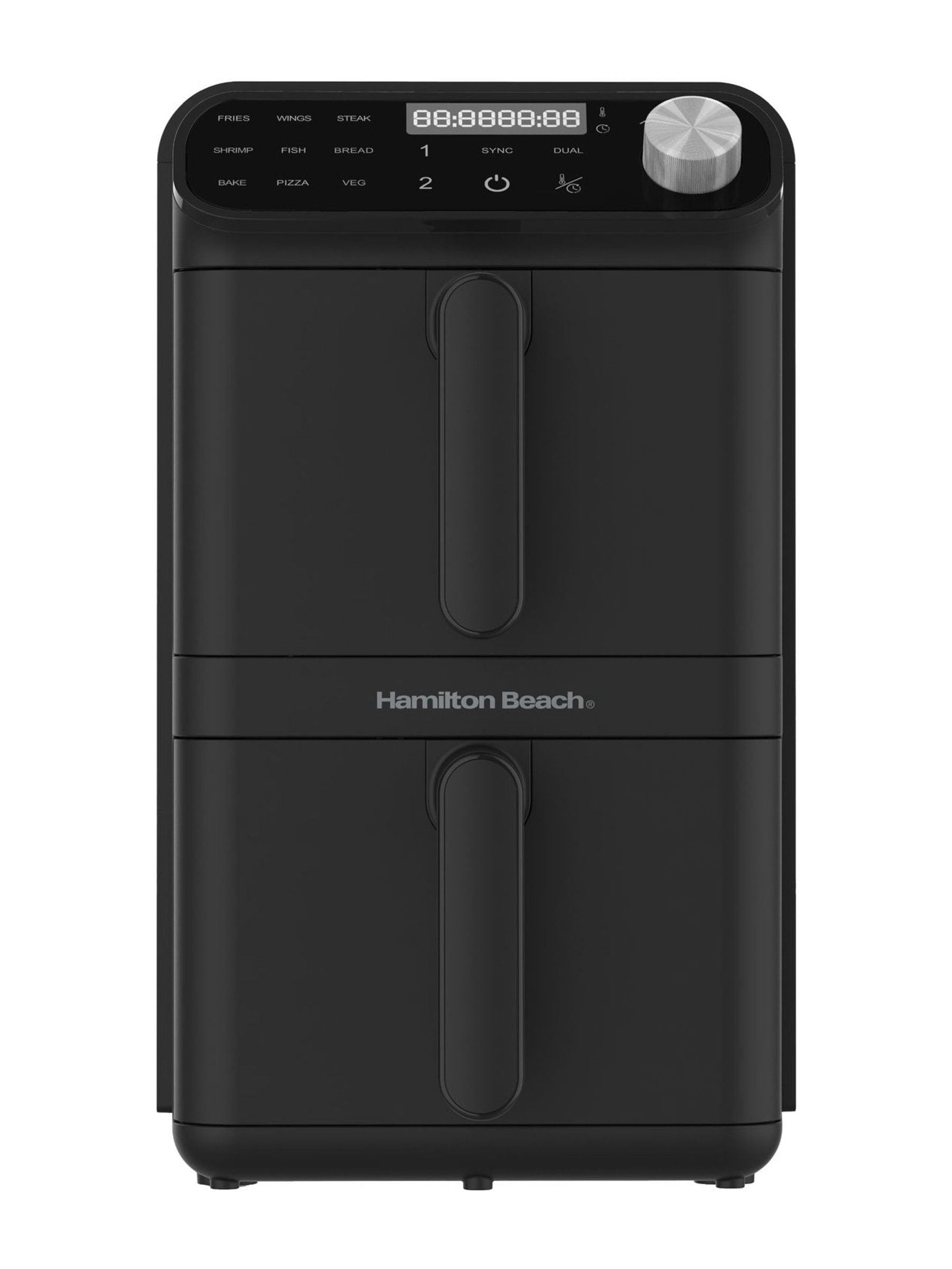 The Hamilton Beach XXL Dual Stack 2-Drawer Air Fryer is the ultimate kitchen companion for quick, healthy, and hassle-free cooking. With its 11L capacity and Double Stack Air Frying Technology, you can cook two different dishes simultaneously, ensuring perfect results every time. The Dual match cook function allows you to match temperature and time across both zones, while the Sync function ensures different foods finish cooking simultaneously, even with varied settings, for effortless meal prep. This versatile air fryer offers 9 cooking functions, including fries, wings, steak, shrimp, pizza, and more, and comes with 2 non-stick, dishwasher-safe 5.5L drawers, grill racks, and stainless steel racks for added convenience. Its 40% slimmer design fits perfectly in smaller kitchens without compromising on capacity, making it ideal for any home. Enjoy healthier, crispy meals with little to no oil, all backed by trusted Hamilton Beach quality and a 2-year guarantee. The Hamilton Beach XXL Dual Stack Air Fryer is a must-have for efficient, space-saving, and delicious cooking. Key Features: 11L capacity for cooking large meals Dual cooking zones with Sync Finish & Dual Match Cook Function 9 cooking functions for versatile meal options Space-saving design, 40% slimmer than standard air fryers. Easy-to-clean non-stick drawers and accessories 2-year guarantee for peace of mind 11L Dual Drawer Capacity: Enjoy the flexibility of two independent 5.5L drawers, giving you a total 11L capacity to cook family-sized portions effortlessly. Flexible Cooking Options: Use the Dual match cook function to match temperature and time across both zones or the Sync function to finish different foods simultaneously with varied settings. 9 Versatile Cooking Functions: Tackle everything from fries and wings to pizza and veg with easy-to-use presets for all your favourite meals. Convenient Accessories Included: Comes with 2 non-stick, dishwasher-safe 5.5L drawers, 2 grill racks, 2 stainless steel racks, and a Recipe Guide for easy and versatile cooking. Compact, Space-Saving Design: 40% slimmer than standard 2 drawer air fryers, it fits perfectly into smaller kitchens without sacrificing capacity or performance. Based on a width comparison of the HBA11B (45.8 cm) to the HB4006 (79 cm); actual dimensions may vary due to measurement methods and rounding. Size: ONE.