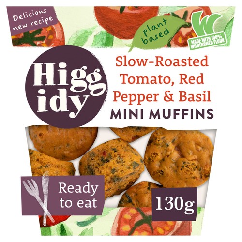 Higgidy presents savoury bite-size muffins featuring a blend of garden vegetables and herbs. These appealing snacks combine slow-roasted tomatoes, spinach, red peppers, and butternut squash purée. Pine nuts are incorporated to deliver a distinct nutty sweetness and a pleasant, moreish texture throughout each bite. They are suitable for vegetarian diets.