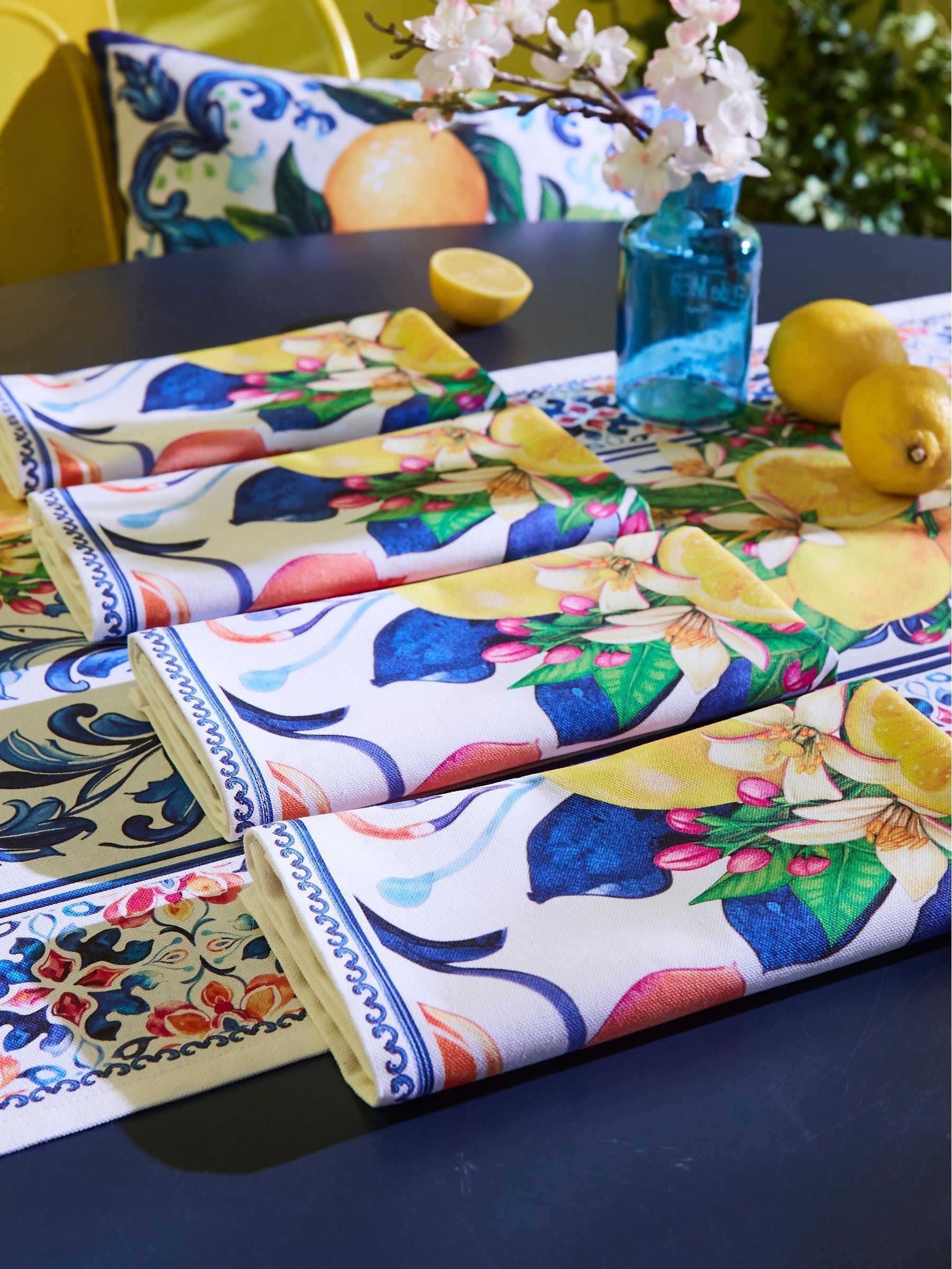 Add some zest to your summer mealtimes with these four lovely lemon napkins. Serving up a bespoke design that’s bursting with beautiful colours, they make it easy to set a table with a difference. Go all-out for the European look and style them alongside the matching placemats and table runner. Appx size 45cm x 45cm.