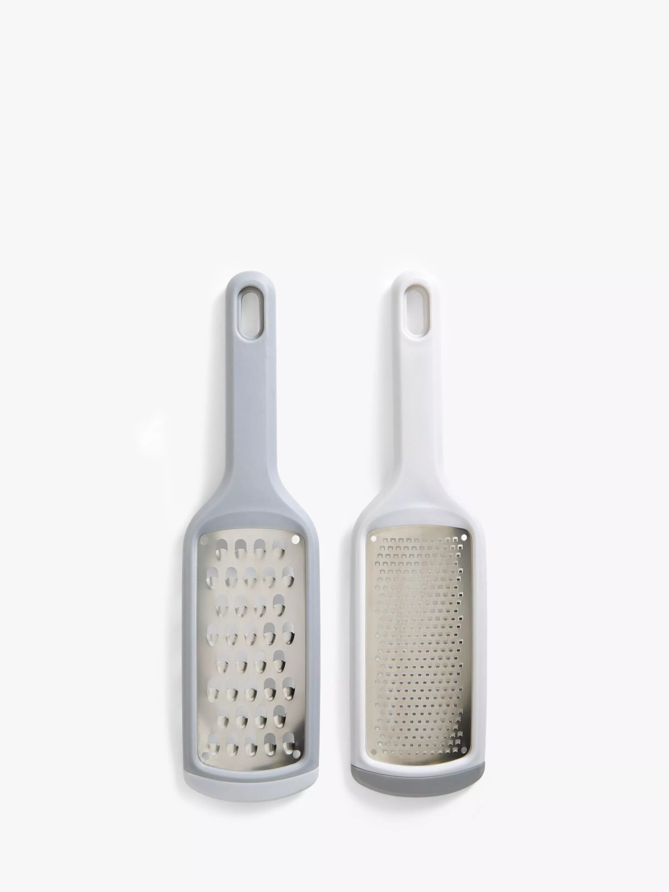 Deux râpes manuelles qui s'emboîtent pour un rangement compact. Elles sont dotées de lames tranchantes en acier inoxydable dépoli à l'acide : l'une pour râper grossièrement les fromages à pâte dure ou le chocolat, et l'autre pour râper la noix de muscade ou zester les agrumes, afin d'agrémenter salades, pâtisseries et autres préparations.
