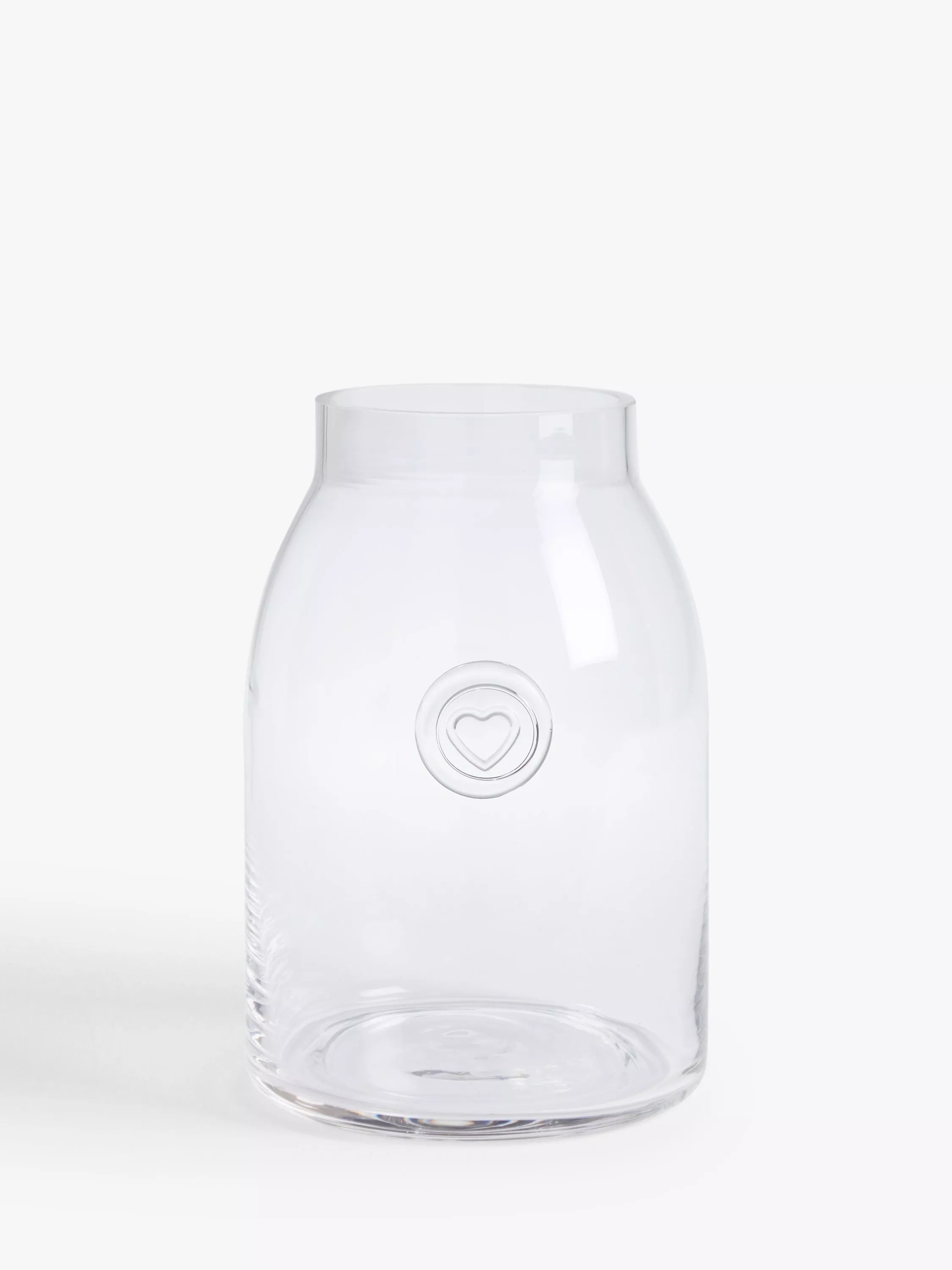 Apportez une touche d'élégance simple à votre intérieur avec ce charmant vase en verre soufflé à la main, inspiré d'un pot de confiture. Idéal pour mettre en valeur vos fleurs préférées ou ajouter une note rustique à votre décoration, ce vase polyvalent s'intègre à merveille dans n'importe quelle pièce. Son sceau en forme de cœur lui confère un détail doux et unique.