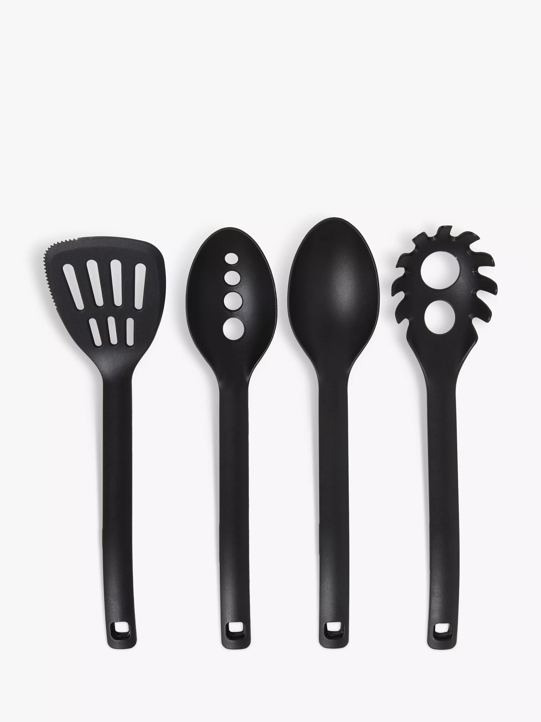 Cet ensemble comprend une spatule ajourée à un bord dentelé, une cuillère pleine, une cuillère ajourée et une cuillère à spaghetti. Fabriqués en nylon résistant à la chaleur, ces ustensiles peuvent être utilisés sans problème sur les surfaces antiadhésives sans risque de rayures.