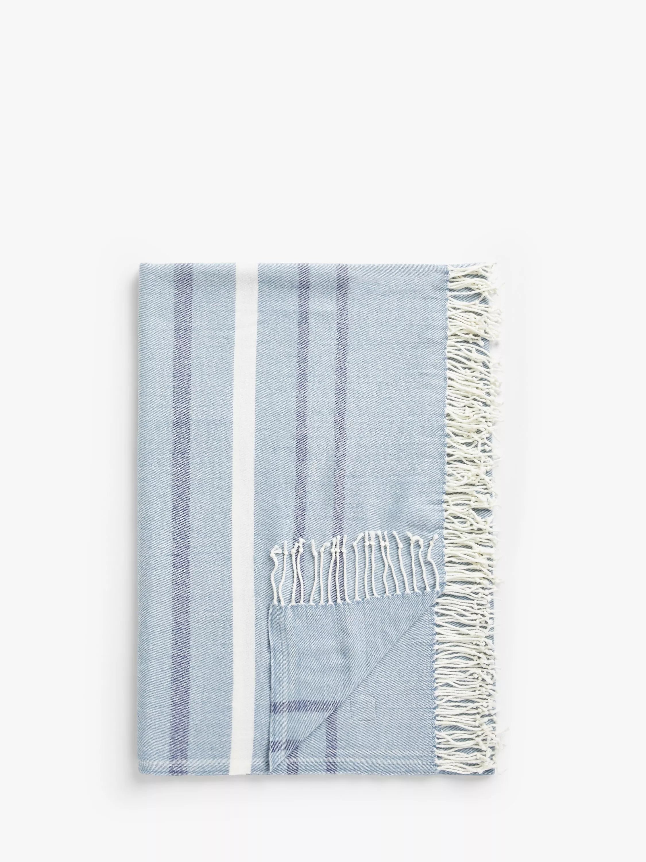 Un jeté doux à rayures tissées, dans des tons de bleu et fini avec une bordure à franges.
