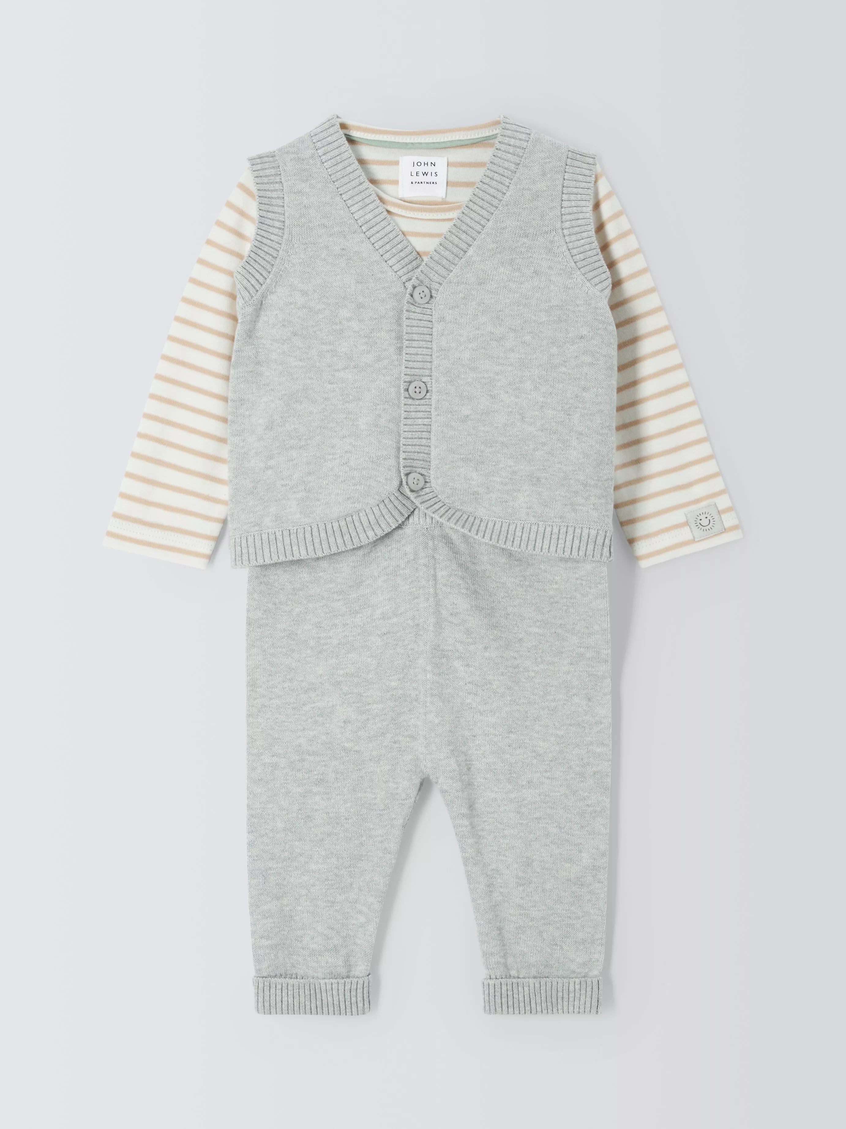 Confectionnée en pur coton, cette tenue bébé de style classique comprend un body à manches longues, un pantalon en maille et un gilet sans manches assorti. Idéale pour les après-midis de jeux, elle se compose de pièces interchangeables à volonté.