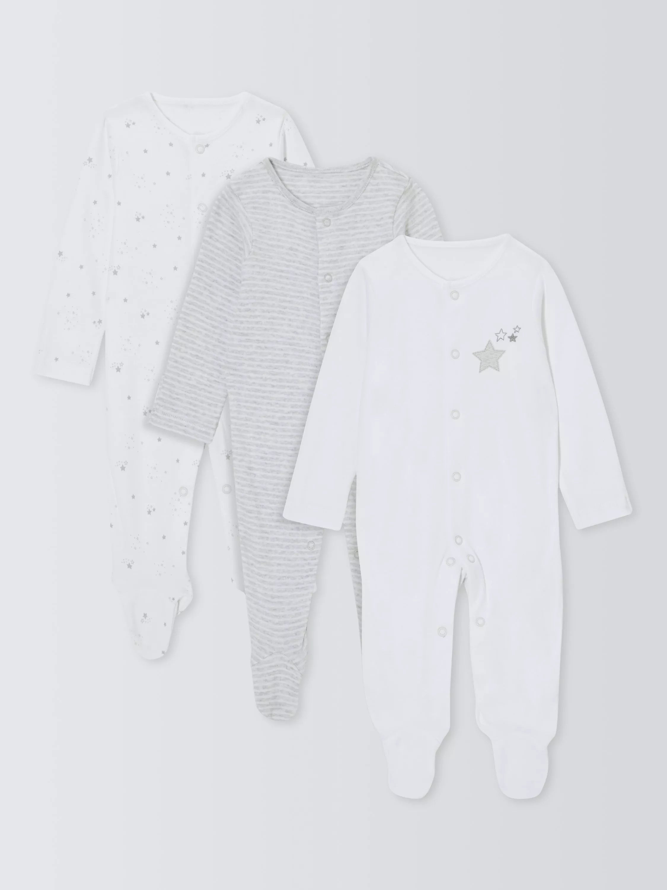 Conçu dans des tons neutres pour plus de polyvalence, cet ensemble de trois pyjamas est confectionné en pur coton, garantissant douceur et confort à la peau de bébé. Il comprend un pyjama orné d'une étoile sur la poitrine, un pyjama à imprimé étoiles et un pyjama à rayures classiques.